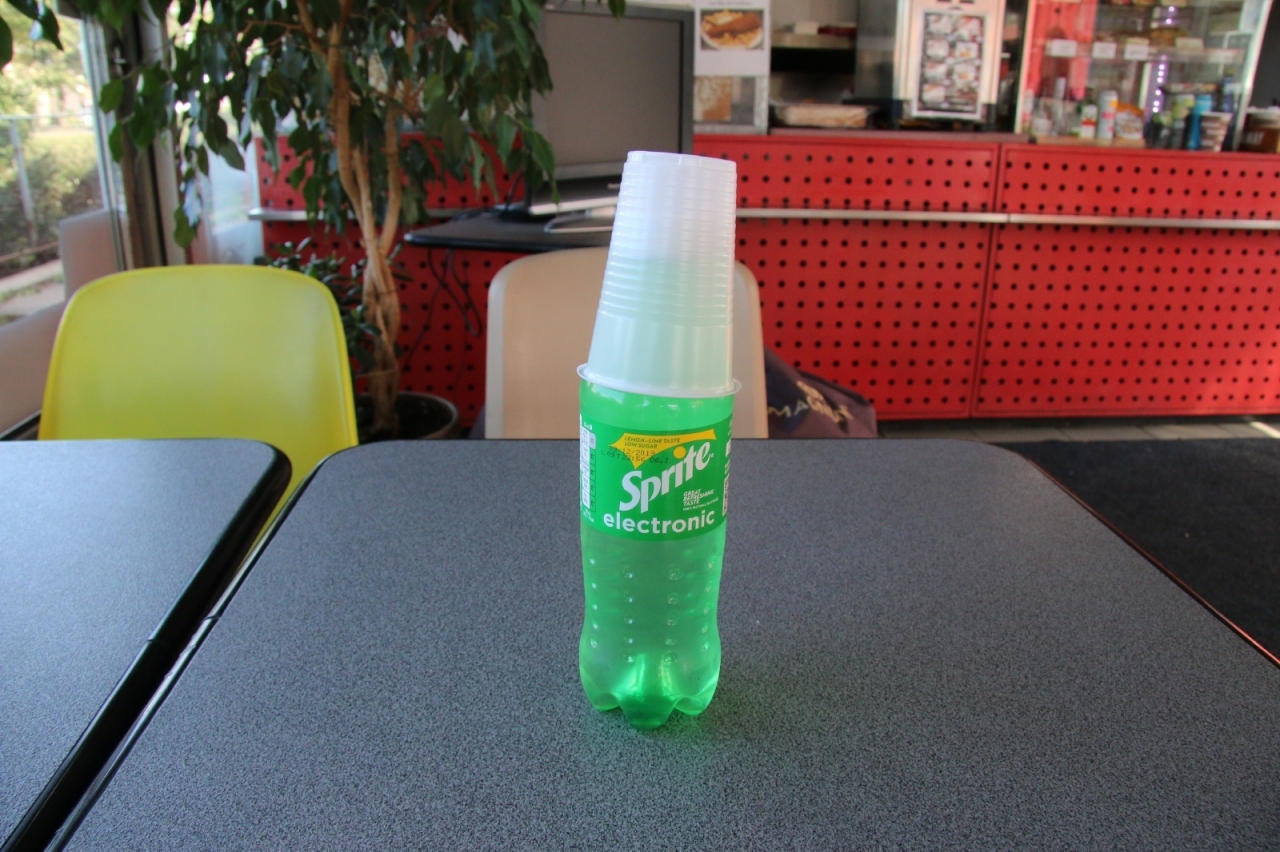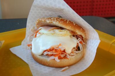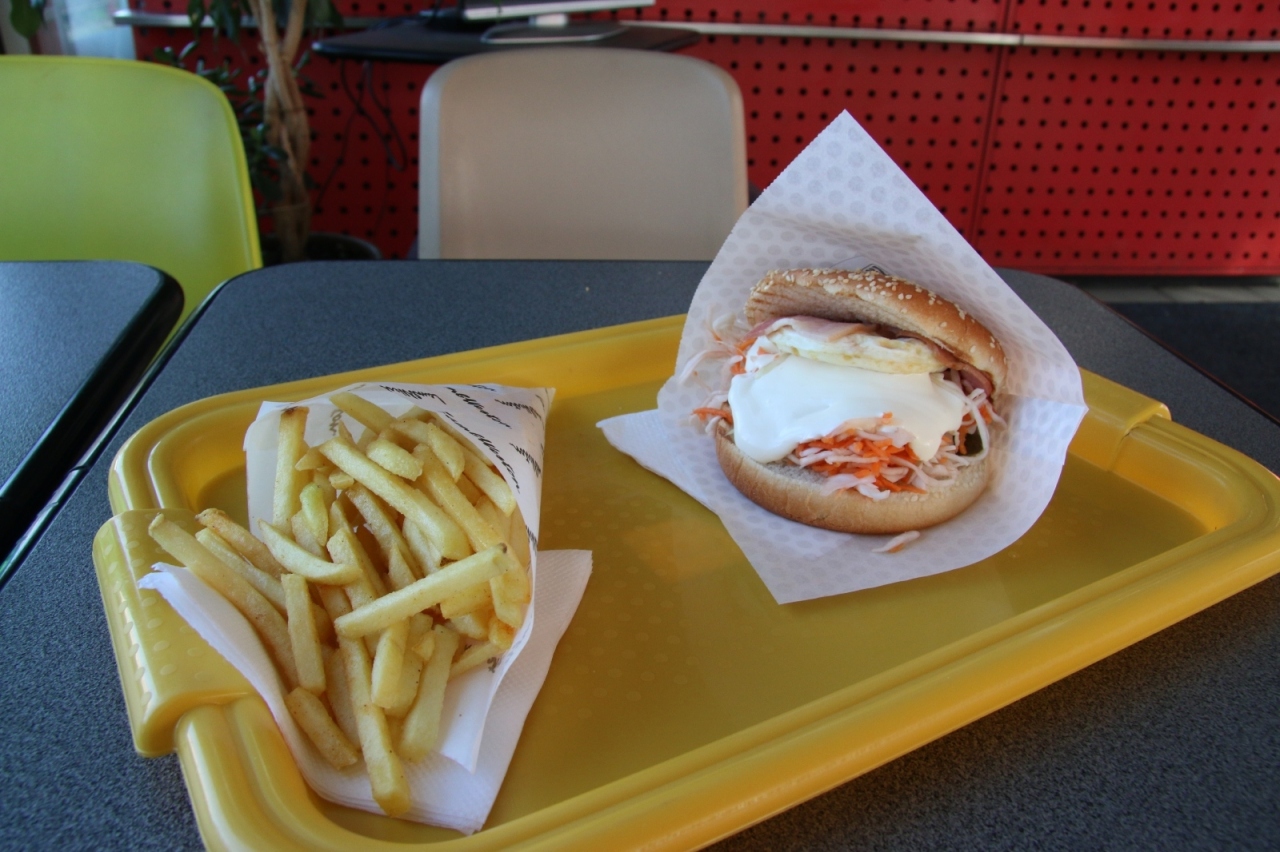 入口で注文してテーブルで待機というスタイル。バーガーでは単品とミールセット(ポテトとドリンク付き)があり、ベーコンエッグバーガーのセットを注文しました。これで6.70ユーロです。ペットボトルにプラコップを渡され自由に席に着くと完成したらトレイに載せて持ってきてくれました。