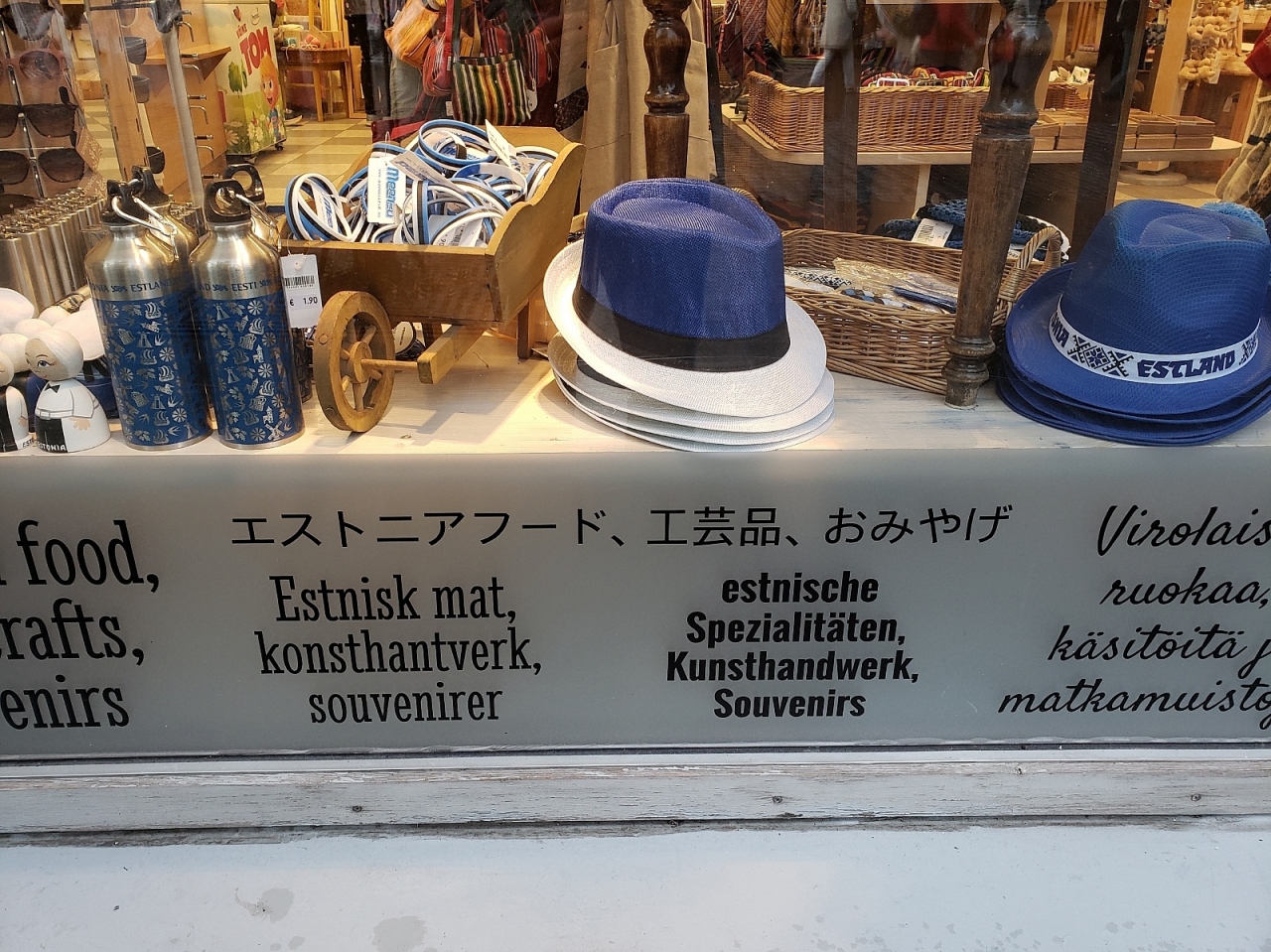 雑貨、マフラー、セーター、服などやハチミツ、ジャムなどの食品系、定番の絵はがきやコースター、コップなどやお菓子など様々なエストニア土産が売っています。