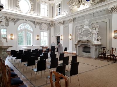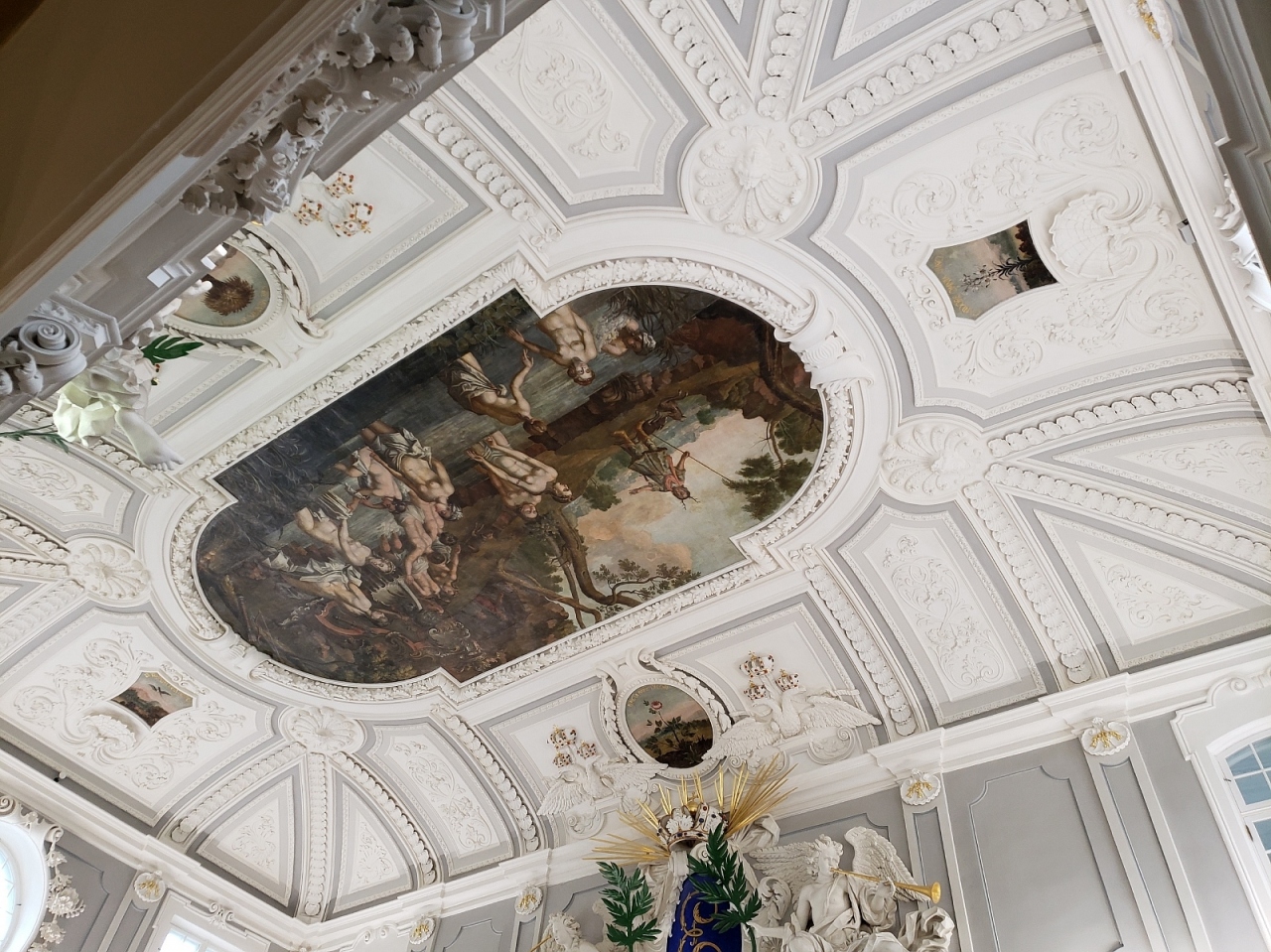美術品だけでなく建物も美しく、大ホールは天井も漆喰で美しく装飾されていて一見の価値有りです。天井の装飾はピョートル大帝から妻エカテリーナ、後のエカテリーナ1世への贈り物の様にもなっています。