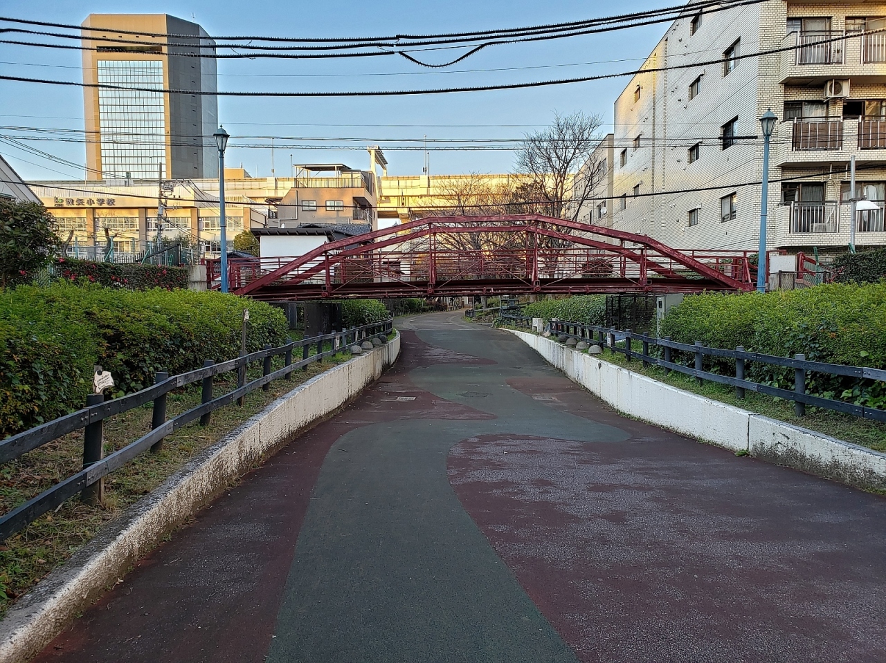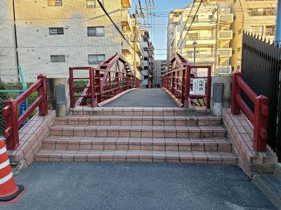 日本最古の鉄橋で、元々は京橋区(現在の中央区)の楓川に明治11年に架橋された日本最古の鉄橋で、帝都復興計画で廃橋になったものの、歴史的な価値を考えてこの場所に保存を兼ねて移転し現在でも現役の人道橋として利用されています。ちなみにこの場所に移転当初は下は八幡堀川という川でしたが、現在は埋め立てられて下は遊歩道になっています。