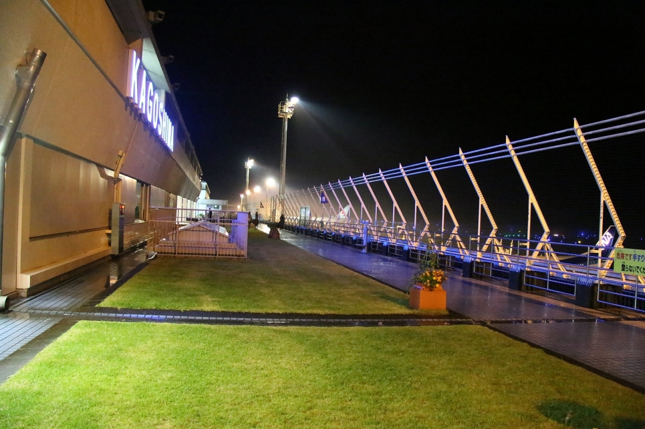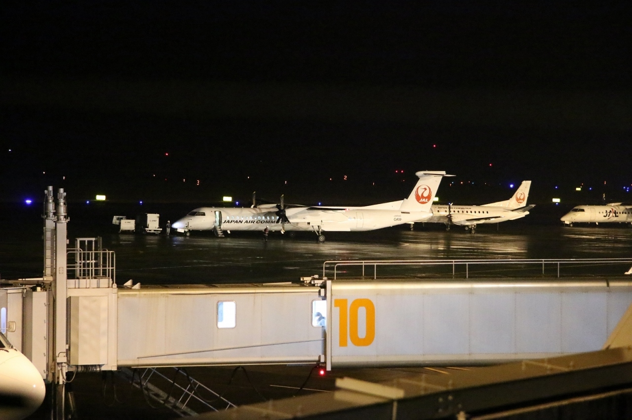 夜だったのでガラガラだったのですが、駐機する日本エアコミューターのDHC8-Q400が見ることが出来ました。デッキの入口はエンジンカウルを模した円形の形になっています。