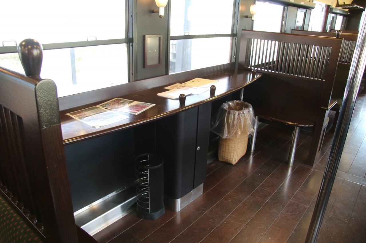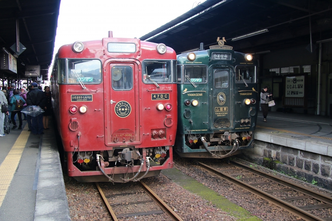 肥薩線の吉松駅から人吉駅まで、列車によっては熊本駅までを運行する観光列車です。吉松-人吉間は山越えでスイッチバック駅も多い難所ですが、この区間は全ての駅に停車して数分の観光タイムがあります。また日本三大車窓に数えられる霧島連山を眺められる場所と、大畑駅の手前で数分間停車し車内からの観光タイムもあります。ワンマン運転扱いですが、ガイドさんが乗り込み車内販売や観光案内を行っていました。