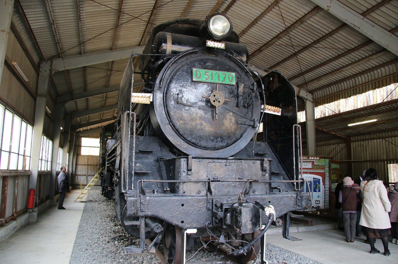 人吉市南部の矢岳駅に隣接する保存庫の中にD51-170と動輪が展示されています。動輪の部分には以前8620形の58654が展示されていましたが、こちらは1988年に現役復帰して現在SL人吉として活躍しているSLです。