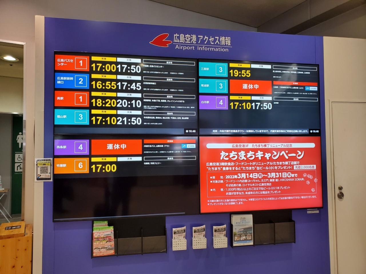 広島県の空の玄関口となる広島空港は設備は良くターミナルも綺麗ですし滑走路も大型機の離発着は問題ない空港なのですがいかんせん立地が最悪。三原市山中にあり鉄道アクセスもないため車かバスでのアクセスです。今回は竹原から乗り合いタクシーで来たので時間も費用もそこまでかかりませんでしたが、広島市内からだと高速道で1時間以上かかるはずです。そんなわけで距離はかなりありますが新幹線の方がというケースも良くあります。