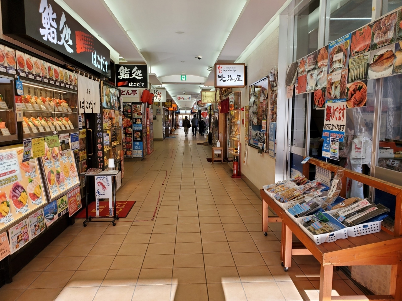 函館朝市の中でも一番函館駅に近い場所にある海鮮丼のお店が立ち並ぶ横丁です。ドアで区切られたスペースなので寒い時期でも歩きやすいと思います。お店によっては外から直接入れますけどね。