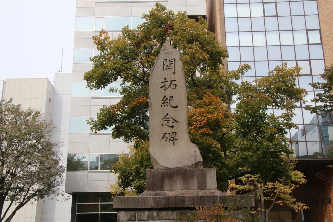 北海道の開拓を当初行っていた開拓使が廃止された後に札幌神社宮司らが募金を集め1886年に建立された碑です。祈念碑でも記念碑でもなく紀念碑となっていました。この字は国家事業の場合に使うそうです。題字は古代中国の書聖の王義之という人のものから5文字拾って作成したものだそうです。