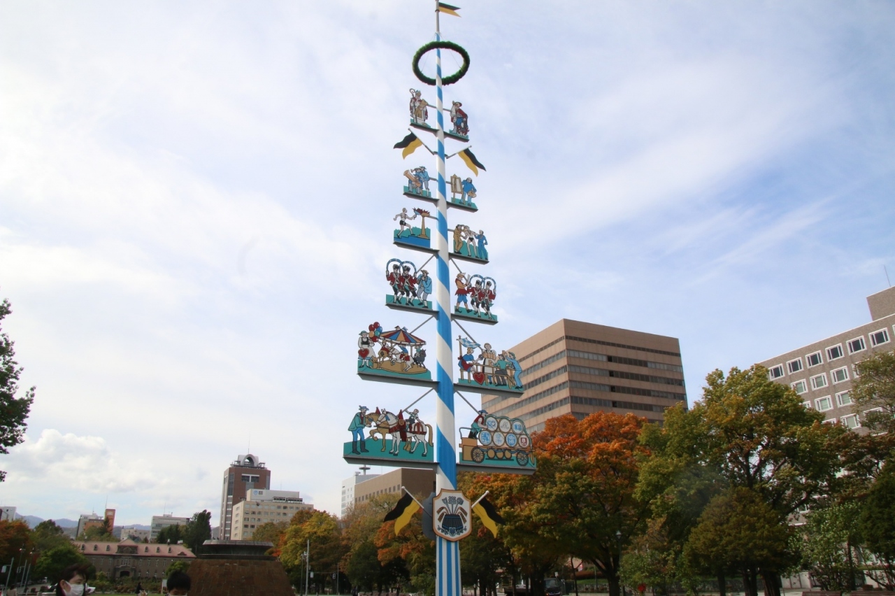 大通公園の西側、バラ園の近くにあるモニュメントです。札幌市とミュンヘン市は1972年にオリンピックを開催しその縁で友好都市となりミュンヘン市から寄贈されたものだそうです。マイバウムはドイツ語で5月の木を意味し、ミュンヘン州の各自治体の広場には自治体のモニュメントとしてマイバウムがあるそうです。