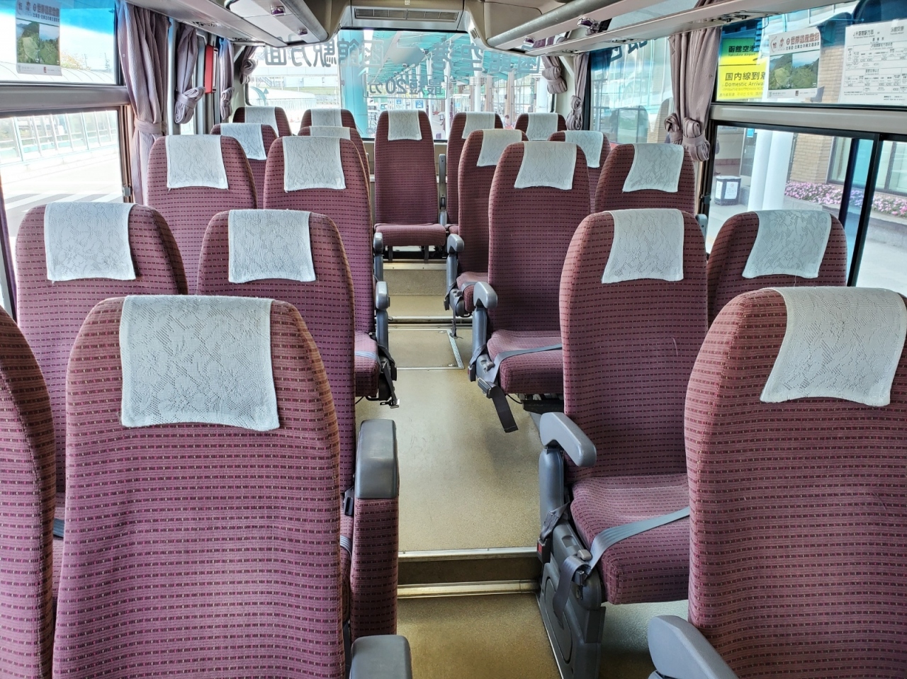 座席はいわゆる観光バスタイプで2-2列シートです。そんなにシートピッチが広いわけではないですが、短い距離なので問題ないと思います。大きい荷物は下部のトランクに積んでくれます。