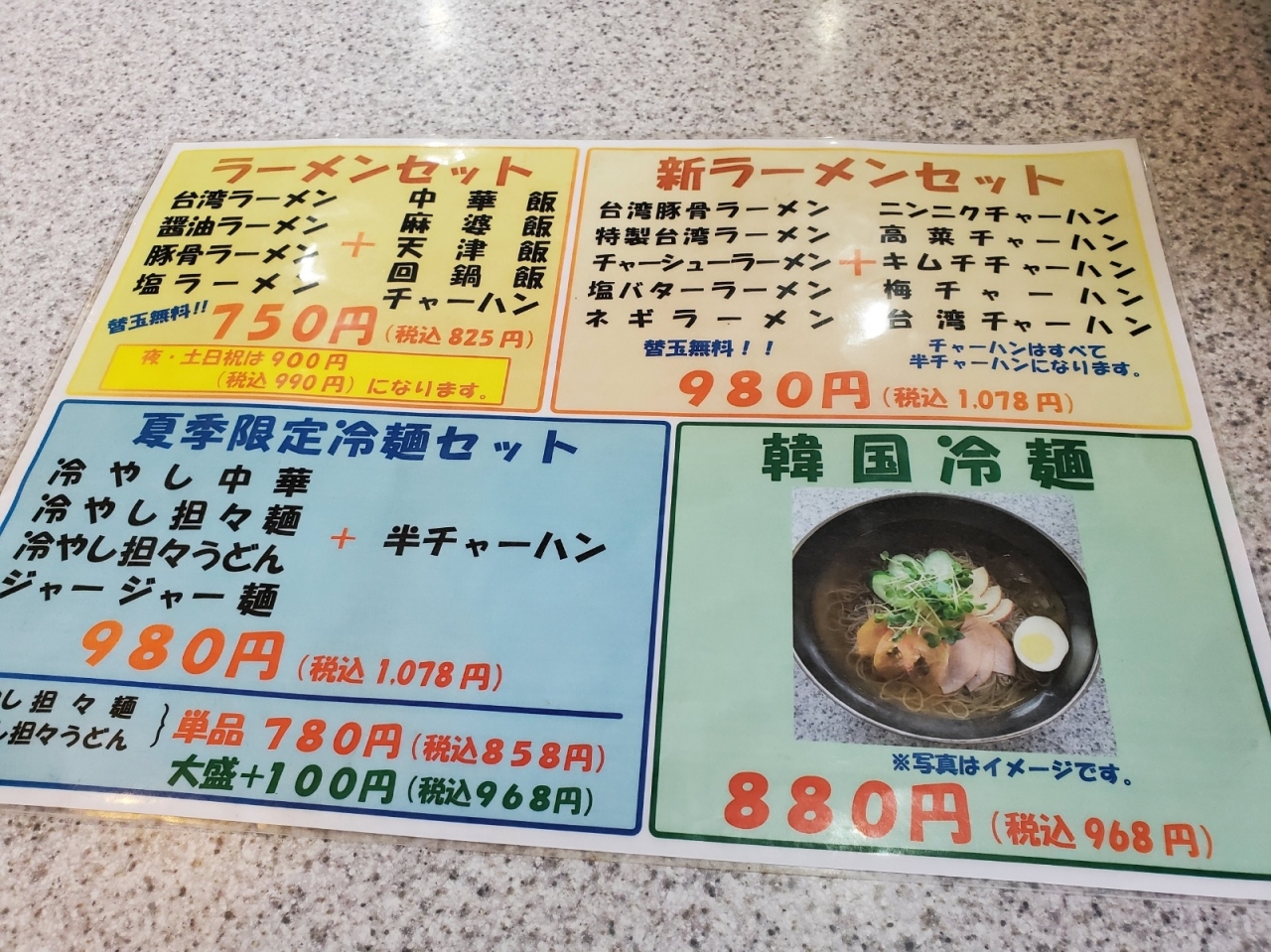 メニューは一般的な台湾料理店と同じですがセットメニューも関東に比べると安価な気がします。そして替え玉無料。とは言えセットメニューは他の台湾料理店と同じくこれがセット?というくらいのボリュームがあるので替え玉何杯もっていうのはよほどでないと難しいかなと思います。味も結構おいしかったと思います。- 旅行時期