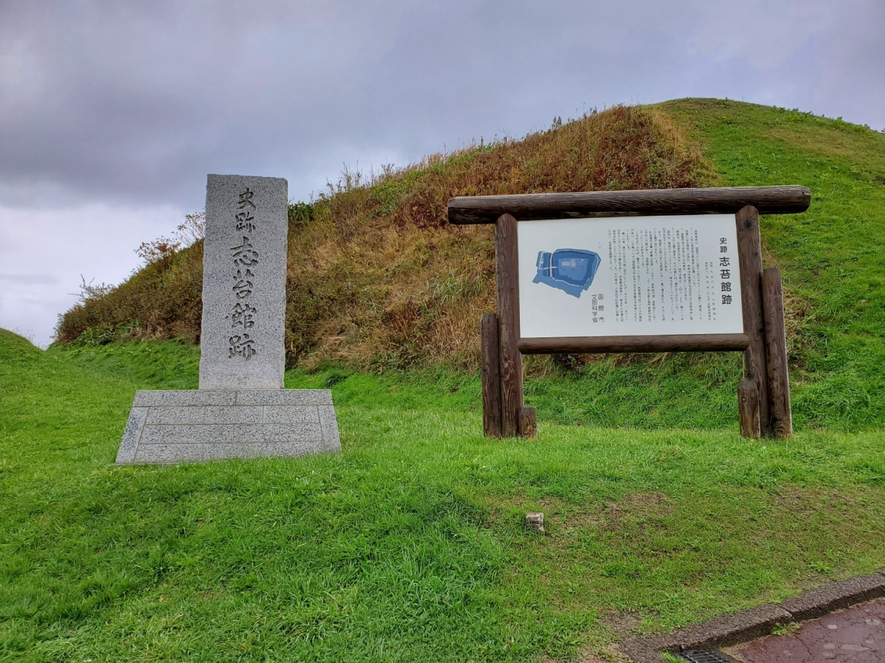 志苔館と書いてしのりたけと読みます。室町時代に本州から和人が進出した際に渡島半島南部に築城した道南十二舘の一つで一番東側にあったものです。当初はアイヌ人と平和的な交易が行われておりその拠点でしたが、鉄器取引のもめ事から和人とアイヌの大規模な衝突であるコシャマインの戦いが勃発、元々もめ事が起きたのがここ志苔館の鍛冶屋とだったので攻撃を受け落城、その後他の10の館もアイヌに占拠されてしまいます。