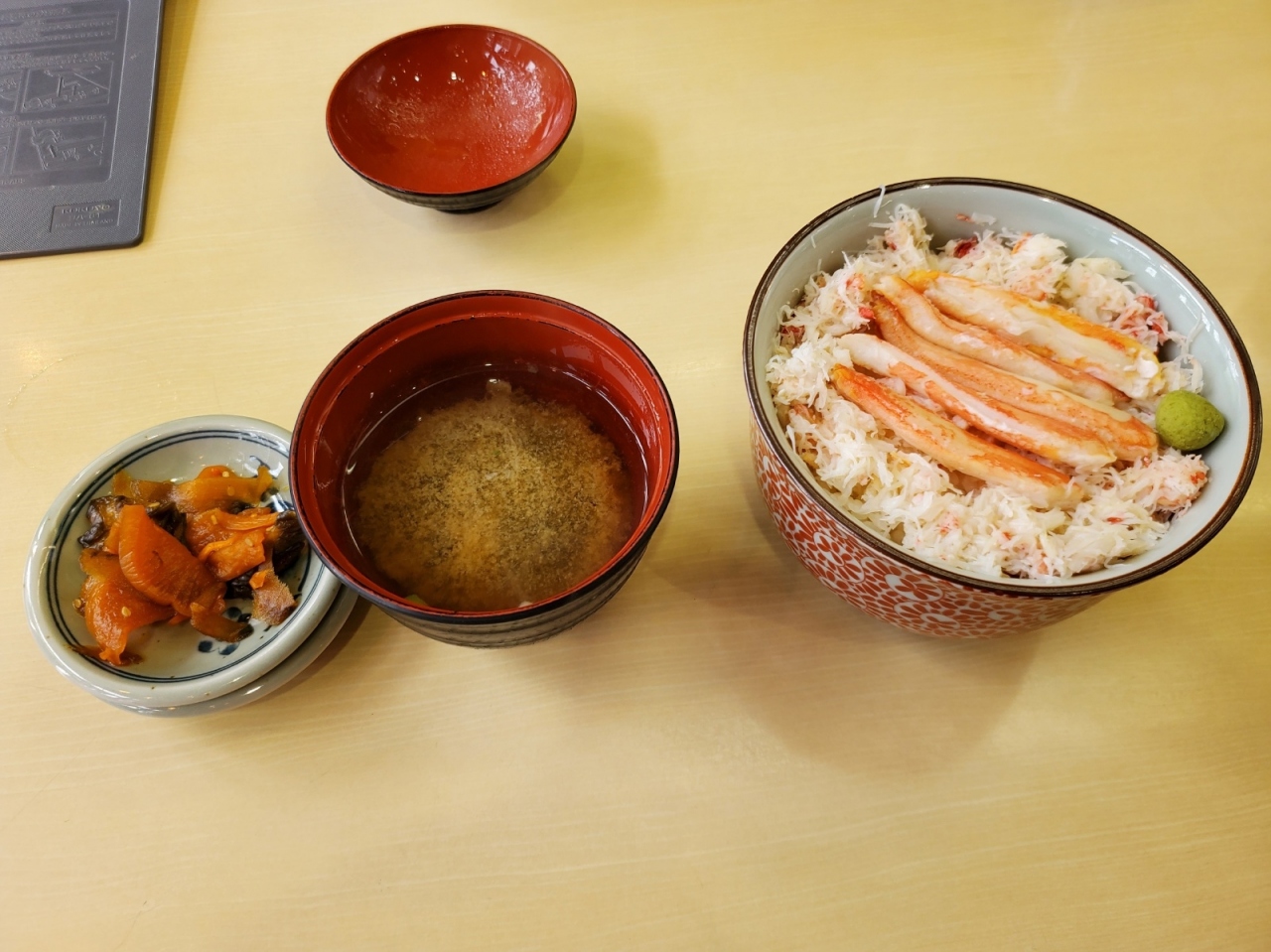 ここではカニ丼を注文しました。鮮度も良いですしカニも思った以上に乗っているどんぶりでした。ごはんも入れたボリュームはというと決して多くはないですがお値段を考えるとこんなもんかなとも思います。