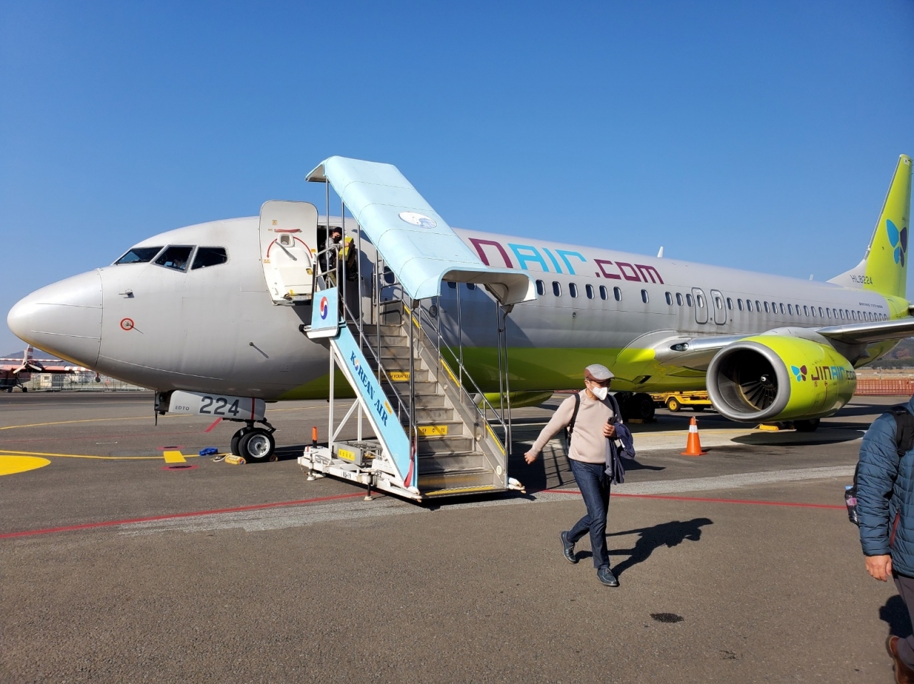 2022年11月時点ではジンエアーが2便、ハイエアーが4便ソウル金浦から乗り入れています。私は朝のジンエアーで来ましたが7割程度客席は埋まっていたと思います。