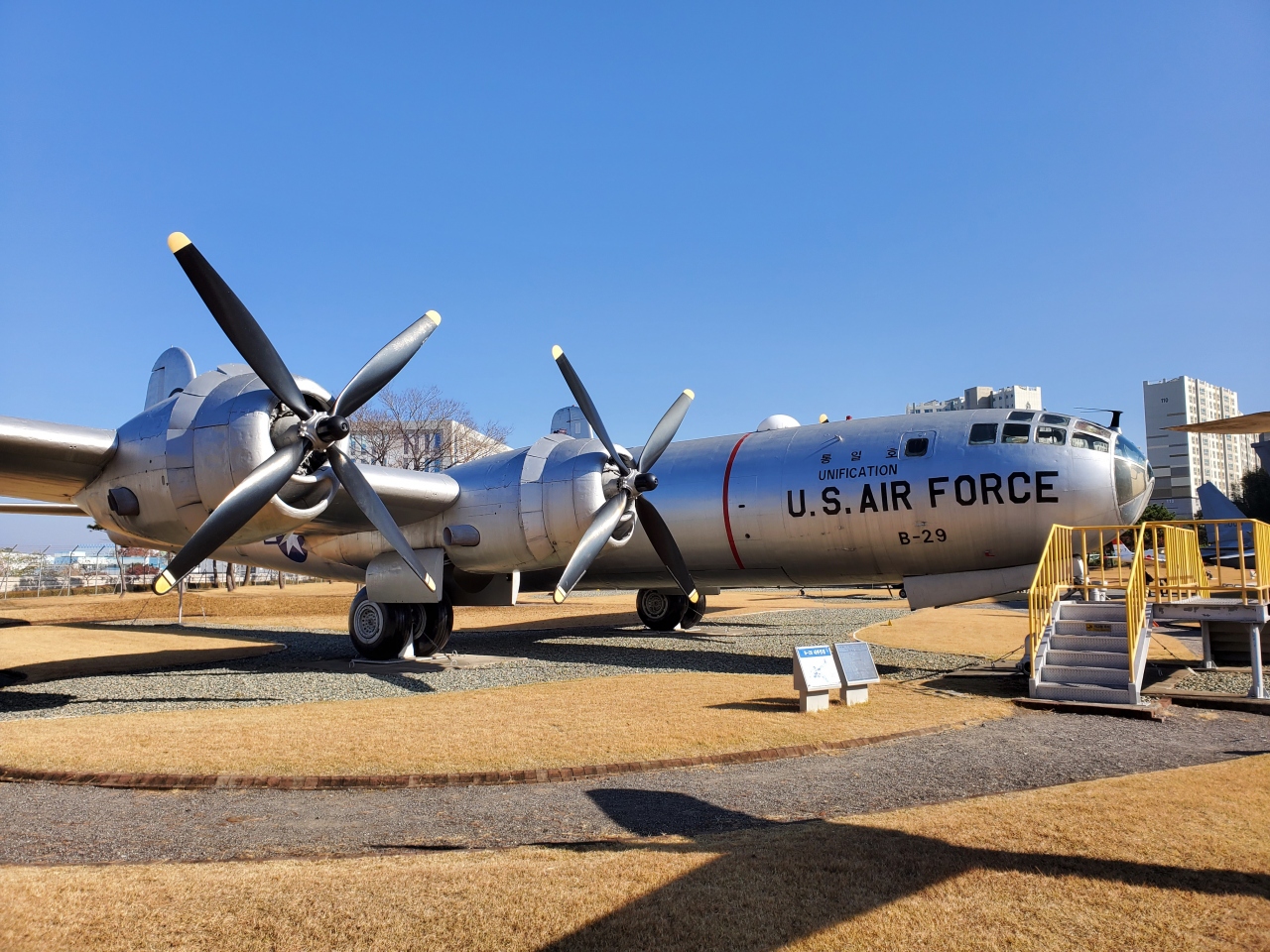 入場料は3000ウォンととても安価。会場は屋外展示スペースと朝鮮戦争史や韓国の航空宇宙開発史が紹介されている館内にわかれます。屋外には電子戦機のDC-3やかつて韓国政府専用機だったDC-4、F-4、F-5、F-86もありますし、何よりアジアでは唯一の展示となっているB-29もあります。他にもF4Uコルセア、F9F、IL103などなかなか見る事が出来ない機体も・・・。実はここに来るのが韓国旅行の一番の目的だったので大変感動しました。