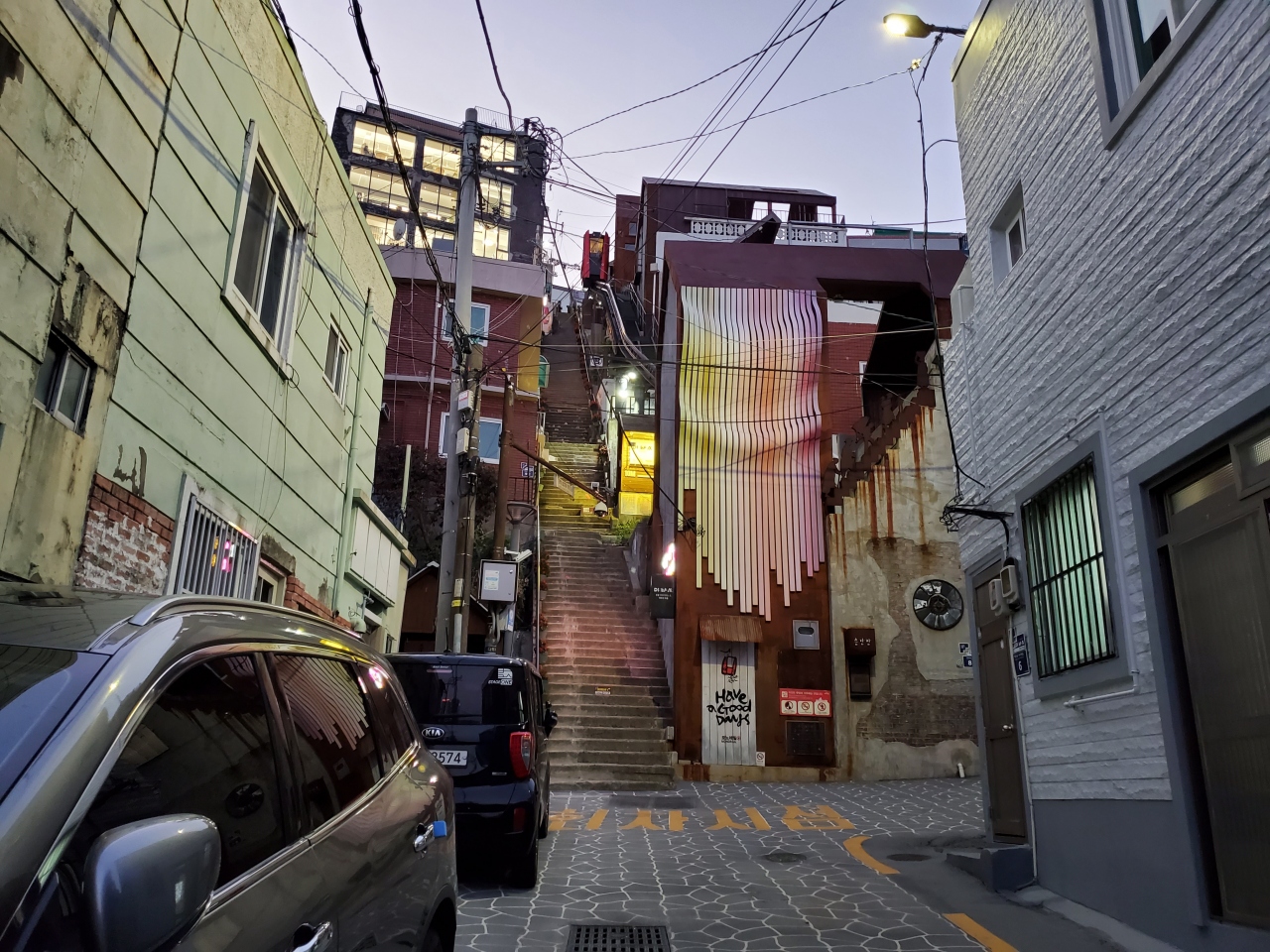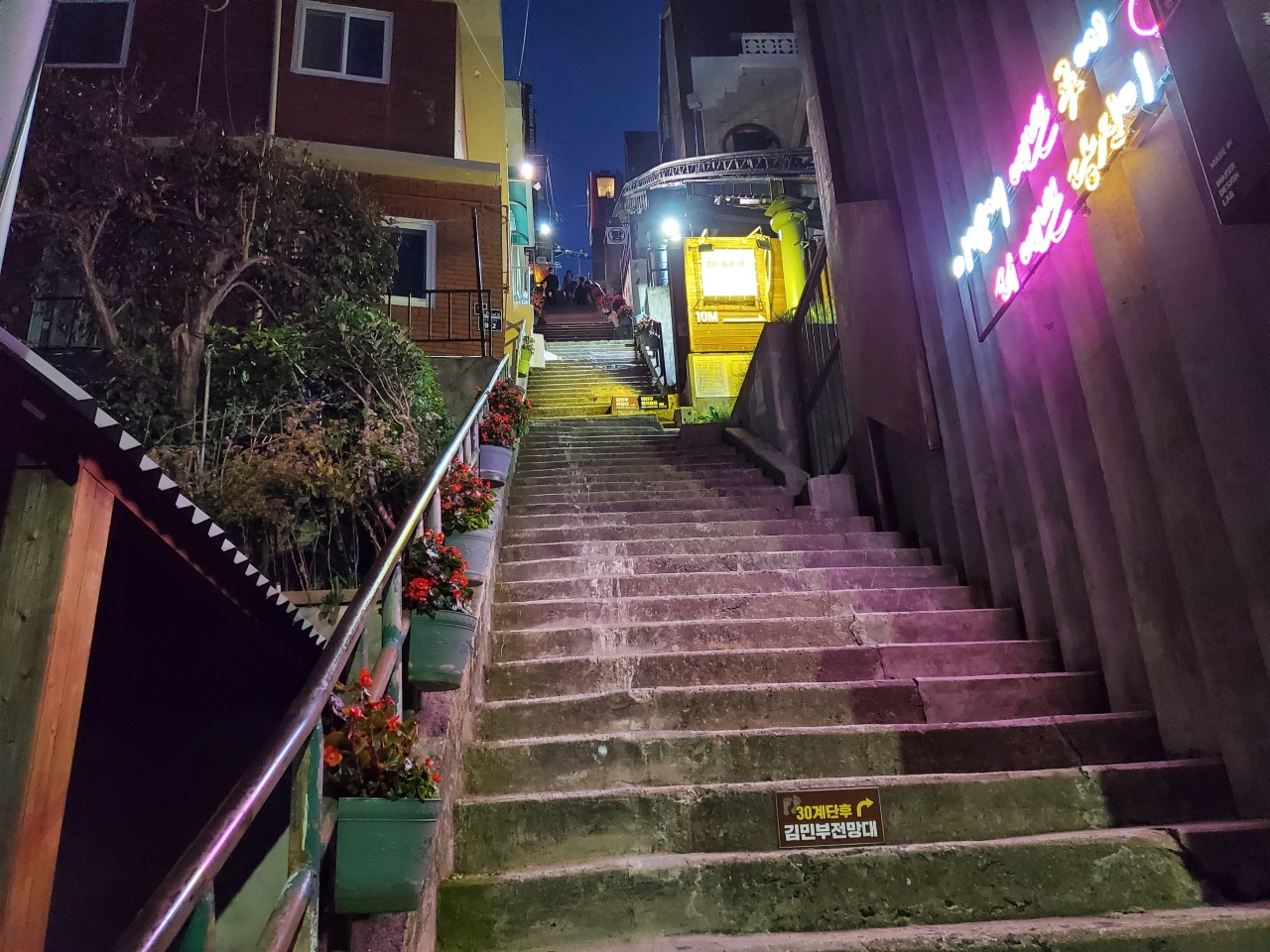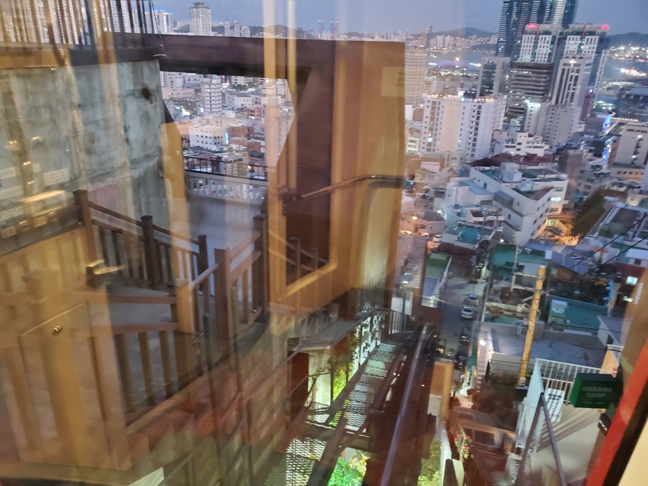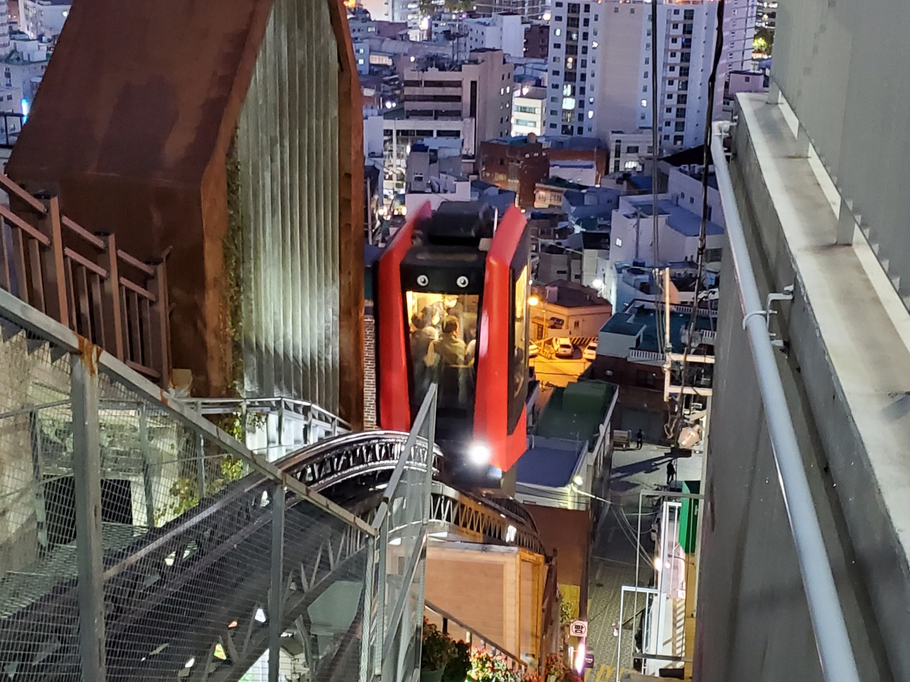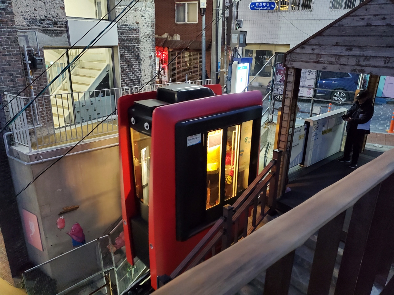 釜山は港町で周囲に山が多く見晴らしはいいんですが、上るのは大変なんですよね。この釜山駅西側になる草梁イバグキルも168段階段という名前の通り168段ある階段があり、上った上は絶景なんですが結構しんどいです。また観光地というわけではなく住宅地でもあるので地元の人の足としても必要だったようでエレベーターが設置されていました。元々この辺りは朝鮮戦争時に釜山以外韓国が領土を失陥した際に多くの難民が移り住んだという歴史がありますが、よくこんなところに家があるなというような環境なので、こういうものがあると便利だったんでしょうね。再開発も進み再設置されるようですが、街の雰囲気も変わってくる様です。