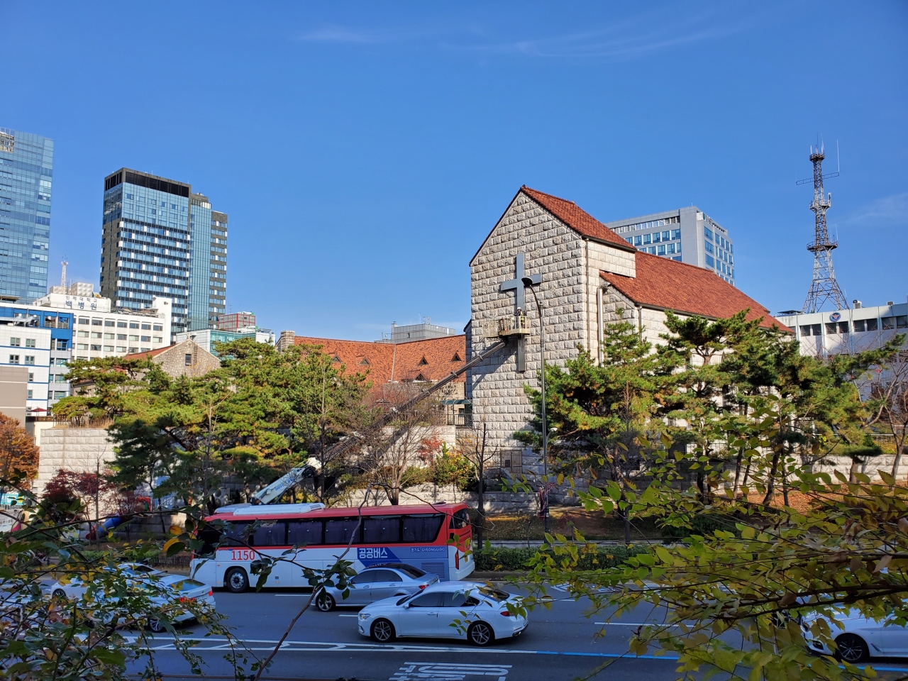 明洞にある教会というと明洞聖堂が有名ですが、道路を挟んで反対側にあるこの教会もとても立派で目を引く教会です。韓国はキリスト教徒が多いので当然ですが教会も多い一方、有名な教会以外は都会にあっても地元の人の祈りの場ですから注意が必要です。道路越しに立派な教会だなと思いながら写真を撮影して通り過ぎました。