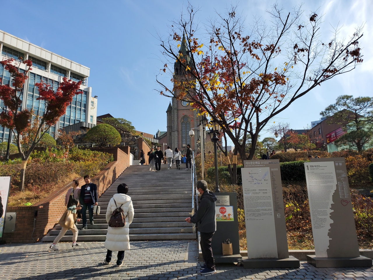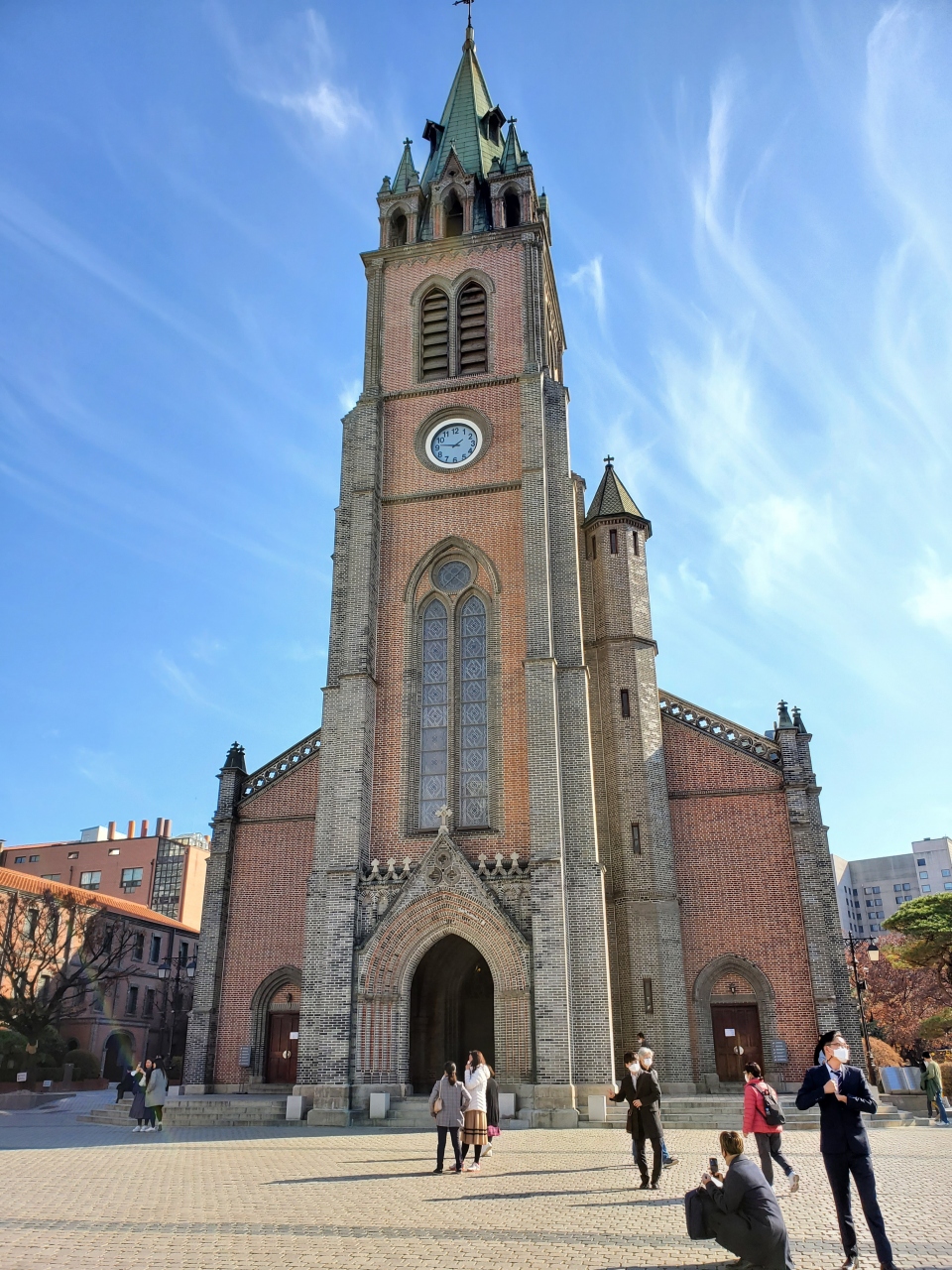 明洞というと賑やかな繁華街、買い物、屋台、というイメージですが明洞の外れ、明洞駅から徒歩10分ほどの所に1898年に建築された韓国で一番古いゴシック建築の聖堂があります。韓国はキリスト教徒が多く教会は多く見ますが、こちらは観光地化していて見学も自由に出来るそうです。ただ当日は結婚式なども行われていて中を見るのはためらわれたので外観のみ見てきました。