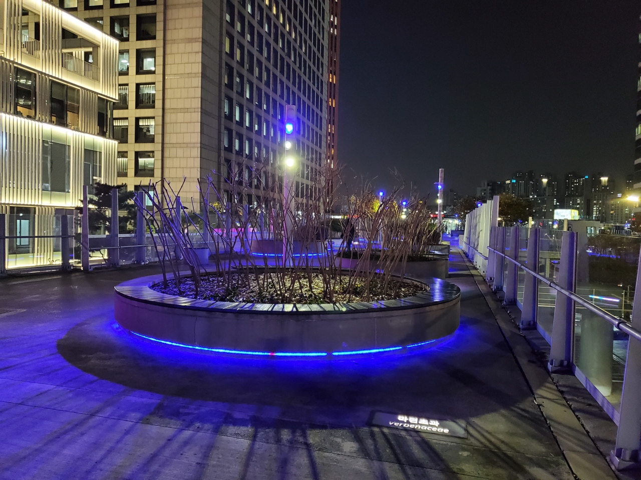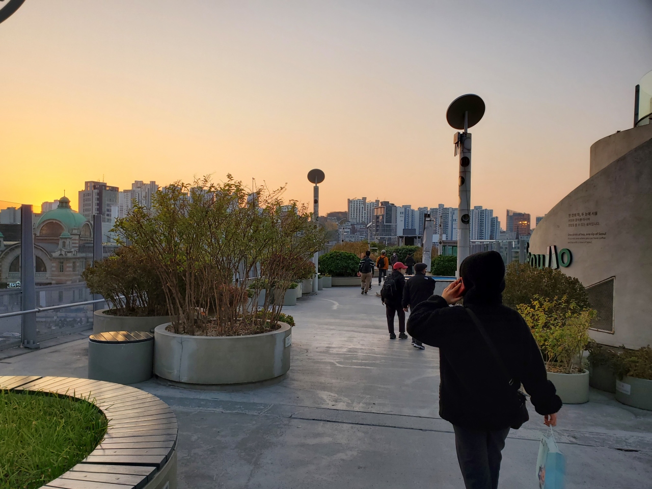 元々は南大門付近からソウル駅を通りソウル駅西口側へ通っていた自動車専用道を遊歩道に転換した道で、ソウル路7017の70は道路が完成した1970年、17は遊歩道に生まれ変わった2017年をさすそうです。ソウル駅西側から歩いて入る事も出来ますし、バスターミナルを過ぎた東側からも入る事が出来ます。南大門側はスロープになっていて南大門近くまで遊歩道として歩くことが出来ます。