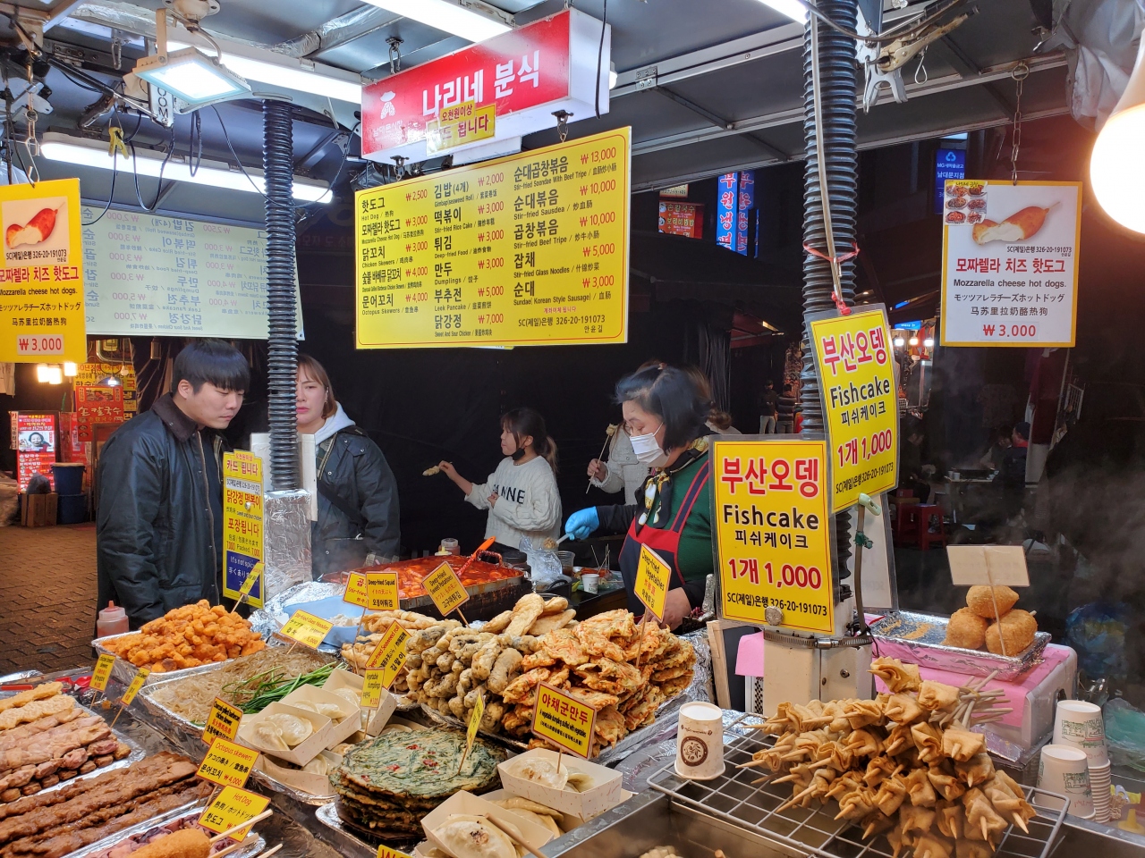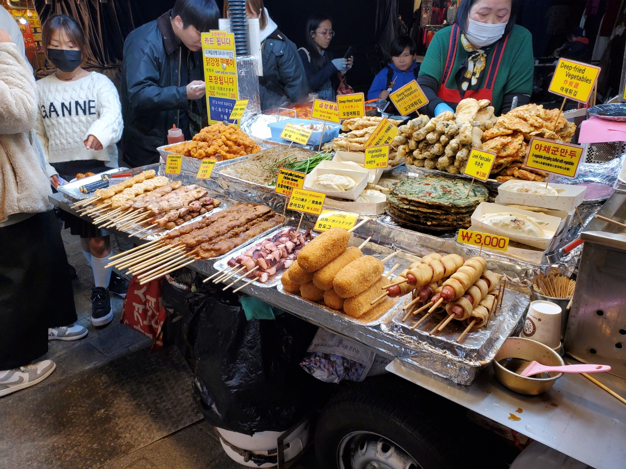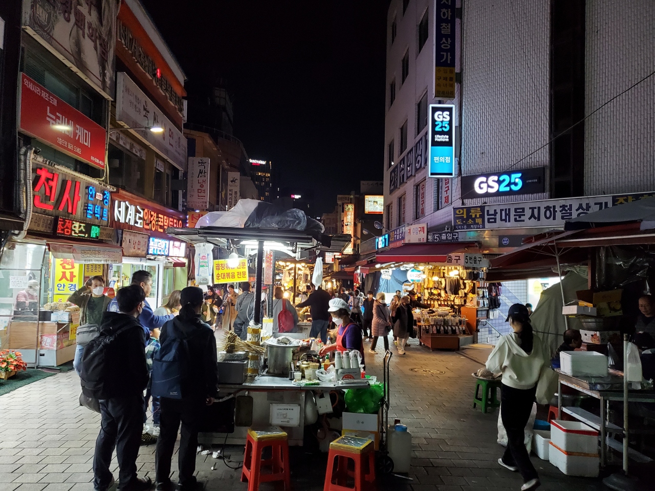 崇礼門の近くから会賢駅付近まで広がっている市場で、お店を構えているところもあれば道路の屋台もあったりという雰囲気です。市場の規模としては東大門などに比べると小さい上に、繁華街としても明洞より小さいですが個人的にはこの市場の雰囲気が好きで食べ歩きを楽しみました。お店によってものが違うので好みによりますが、少量でも売ってくれるお店が多いのでいろんなものを楽しめます。ホットクなどもあれば、洋菓子店もあったりとめぐる楽しみもありますね。料金もそんなに高くなかったです。