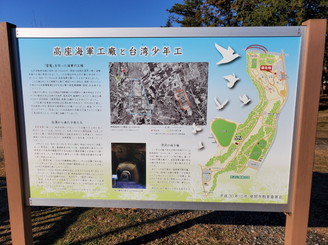 比較的新しい公園の様ですが戦中に造られた地下壕が残っていてそのうち二か所が公開されています。現在でも工場が多い座間ですが戦中は近くに高座海軍工廠がありその為に造られたものだと思います。中には雷電と思わしきレプリカも置かれていました。