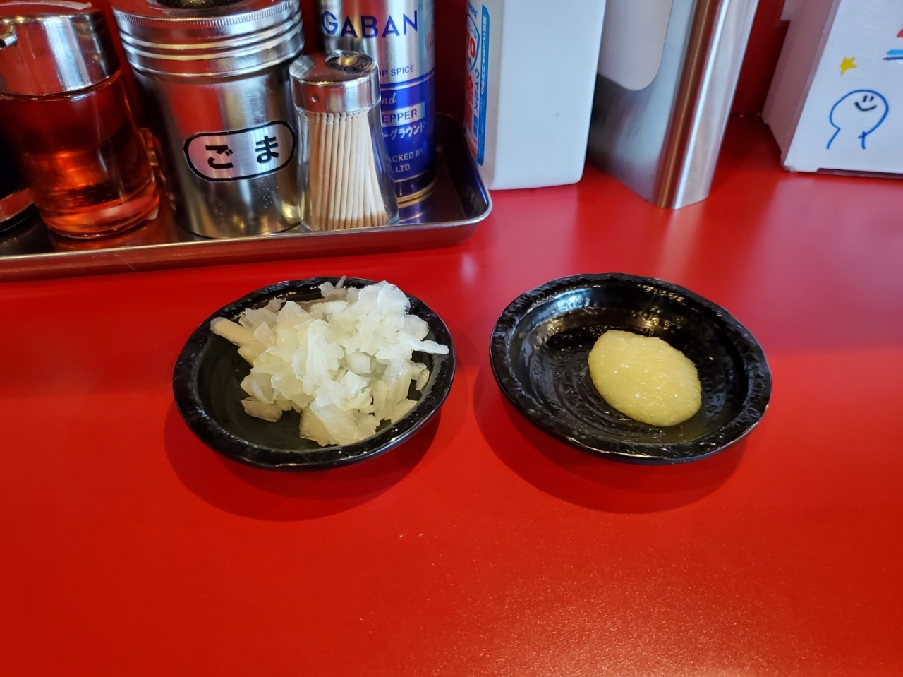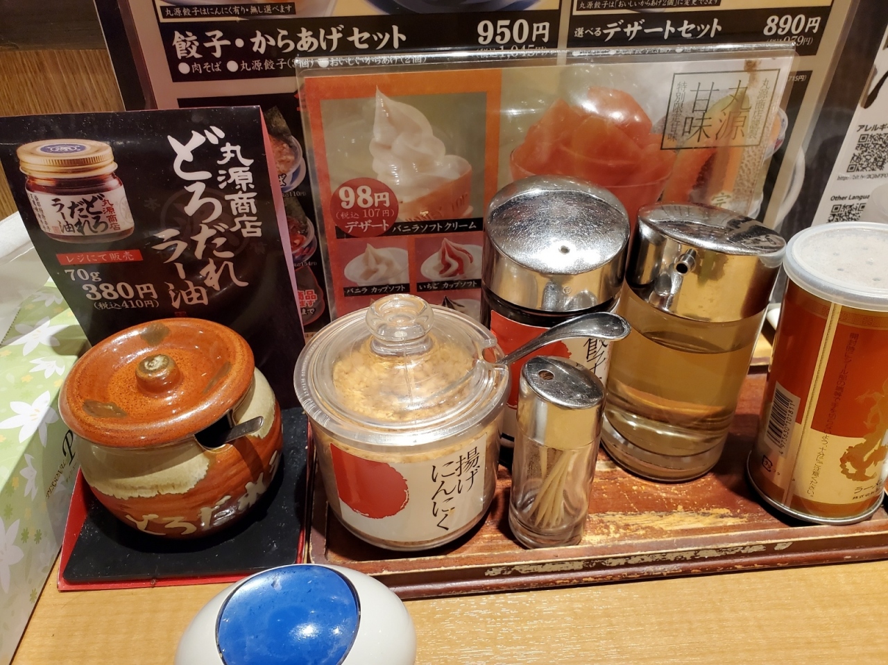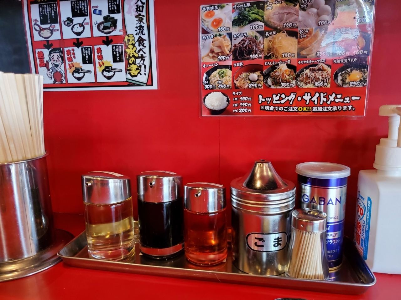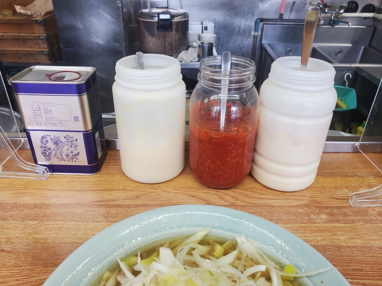 にんにくや玉ねぎはコロナ対策なのか元々なのかはわかりませんが店中央のコーナーにまとめて置いてあり、コショウなどの調味料はテーブルにありました。