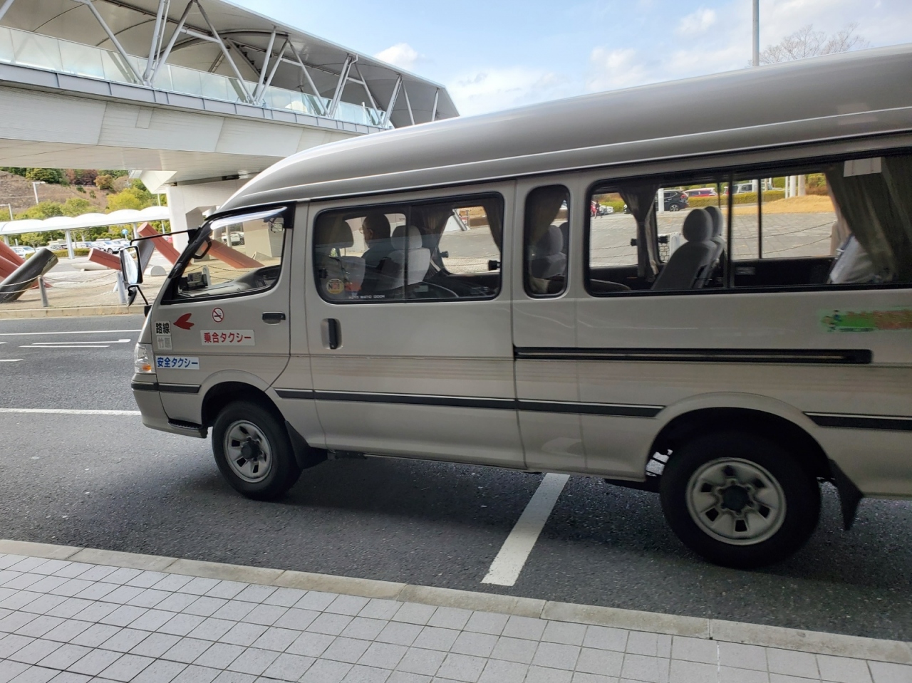 竹原港、竹原駅と広島空港を結ぶジャンボタクシーです。9人乗りのハイエースみたいな車両で運行しているので竹原駅前の観光案内所で聞いたところ予約した方が良いと言われたので当日昼頃に予約して16時代の便に乗りました。私が乗った日は他に乗客一人でしたが満員に近い日もあるようです。