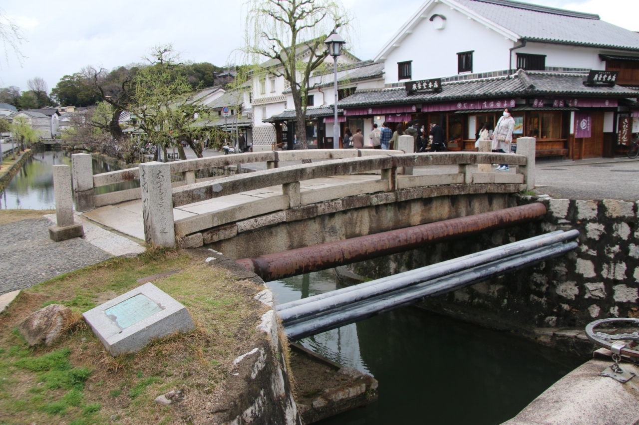 美観地区の中心部、大原美術館前の倉敷川にかかる橋です。現在の橋は1926年皇太子行啓前に架け替えられた橋で後に大原美術館を創設する大原孫三郎の資金援助でかけられました。その為菊の御門の装飾や龍が意匠されるなどとても立派な橋になっています。