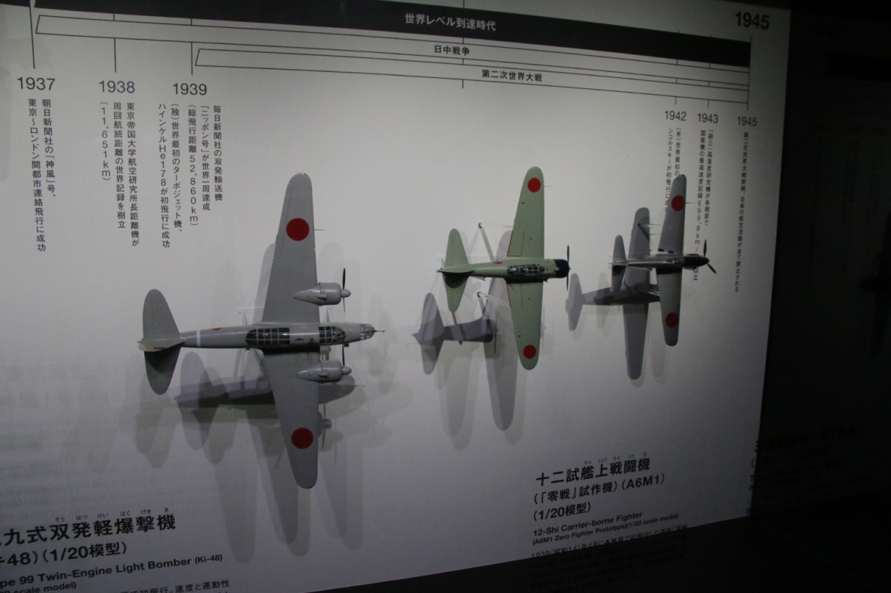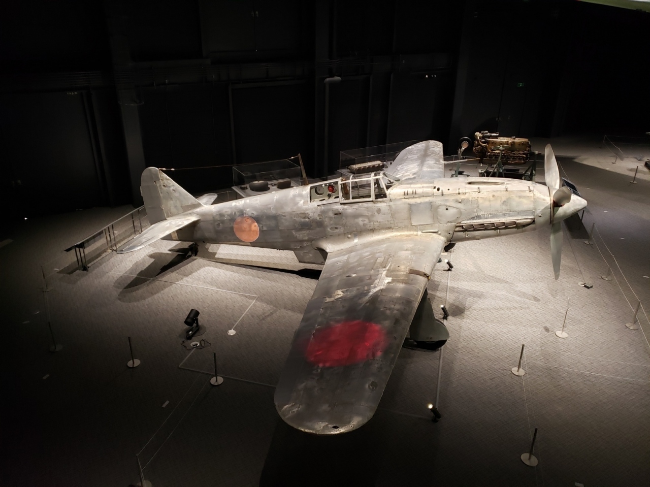 ここの一番の注目は現在世界では唯一戦中の形で残っている三色戦闘機、通称飛燕が展示されていることでしょう。一機だけ別室に保存されていて、ゼロ戦のレプリカとともに展示されています。