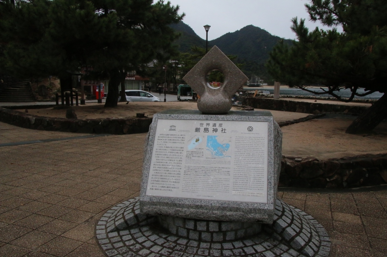 宮島桟橋にある碑のうちの一つです。1996年に世界遺産に登録された事を記念して2000年に建てられたそうです。世界的観光地とあって英語でも詳細が記されていました。碑の上には穴の空いた菱形がありここから除くと大鳥居が見えるそうですが、肝心の大鳥居が改修で足場を組まれた状態でした・・・。