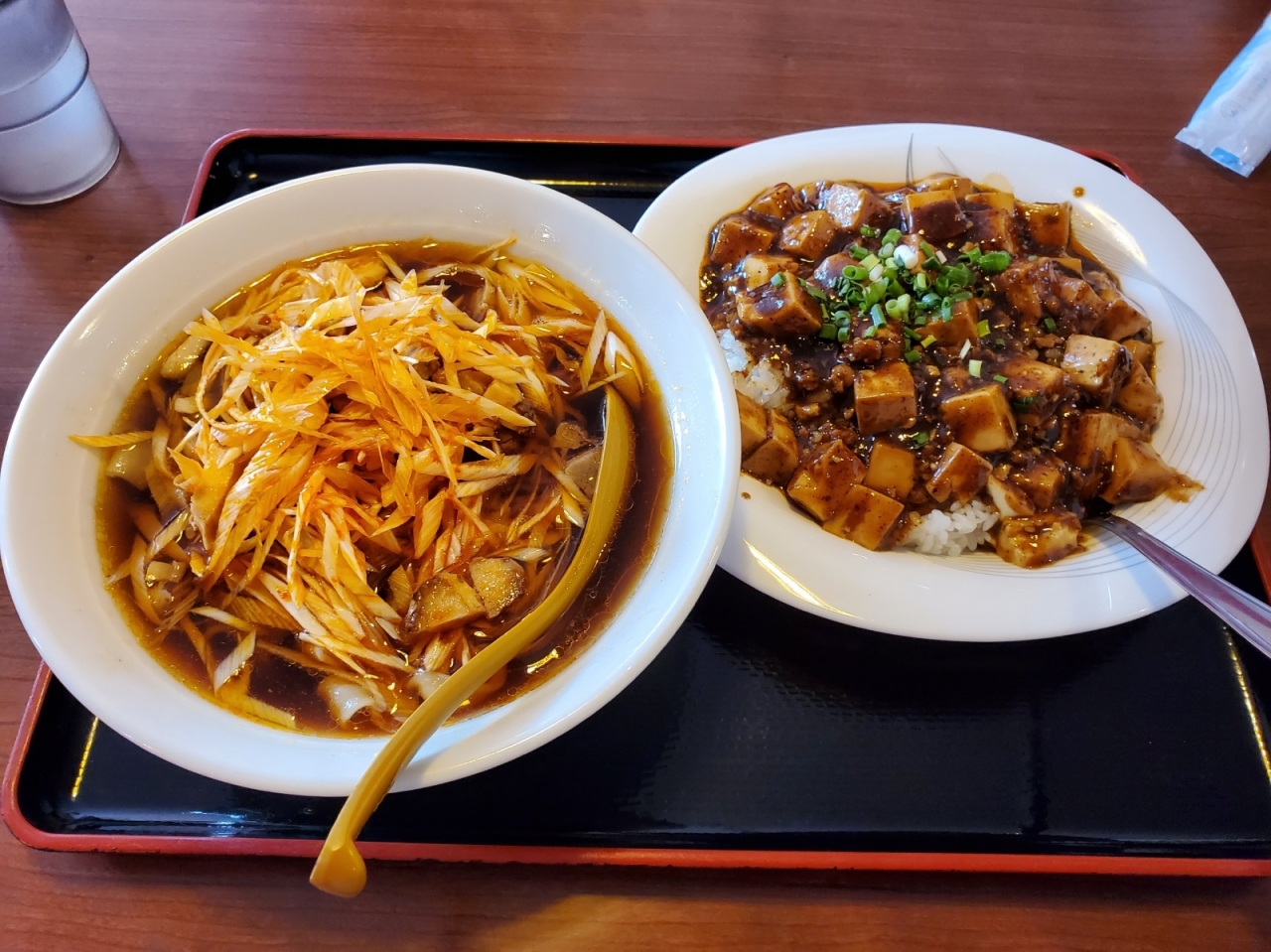 - 胡椒が利いた麻婆飯、適度な辛さのネギチャーシュー刀削麺のセットはなかなか美味しかったです。