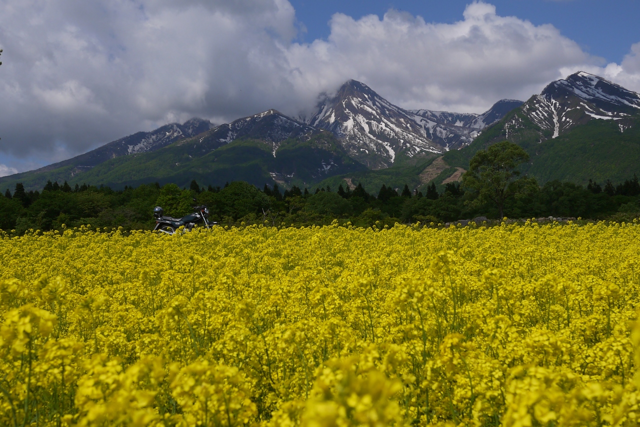 妙高山と花の、コントラストが素敵です。春は菜の花畑、夏はひまわり畑で楽しめます。まわりには地元の採れたてトマト、トウモロコシや新鮮な野菜を売っているお店もあります。 夏は涼しい、高原の風がふいています。