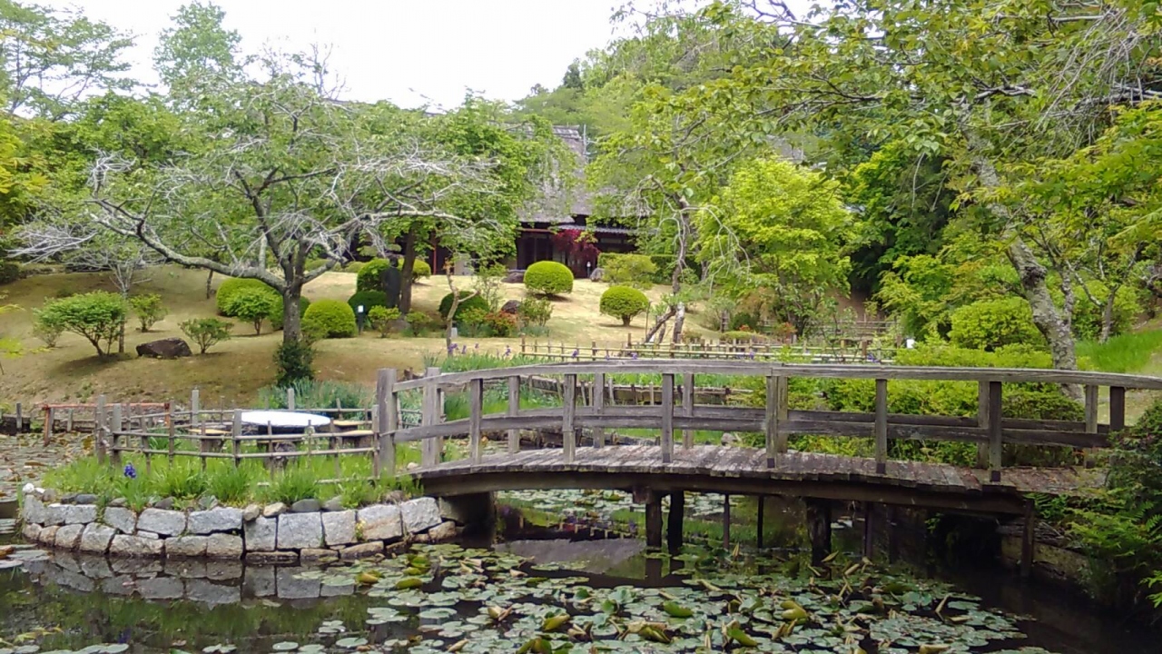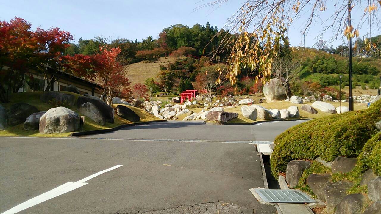 大きな建物と広い庭園。山を切り開いた時に出てきた岩が日本庭園に飾られています。