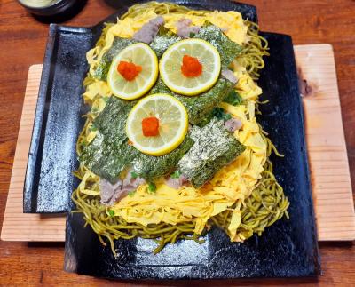 最初は、やわらかい茶そばも、だんだん焦げ目が付いてきてパリパリになってきます。食感の変化も楽しい♪