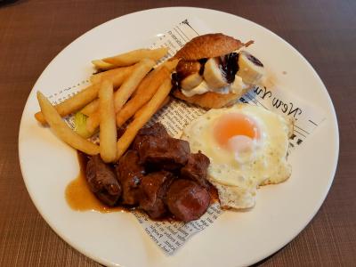 モーニングステーキは、選べるクロワッサンサンドに、フライドポテト、コーヒー(お代わり可)が付いて700円くらい(^-^*)