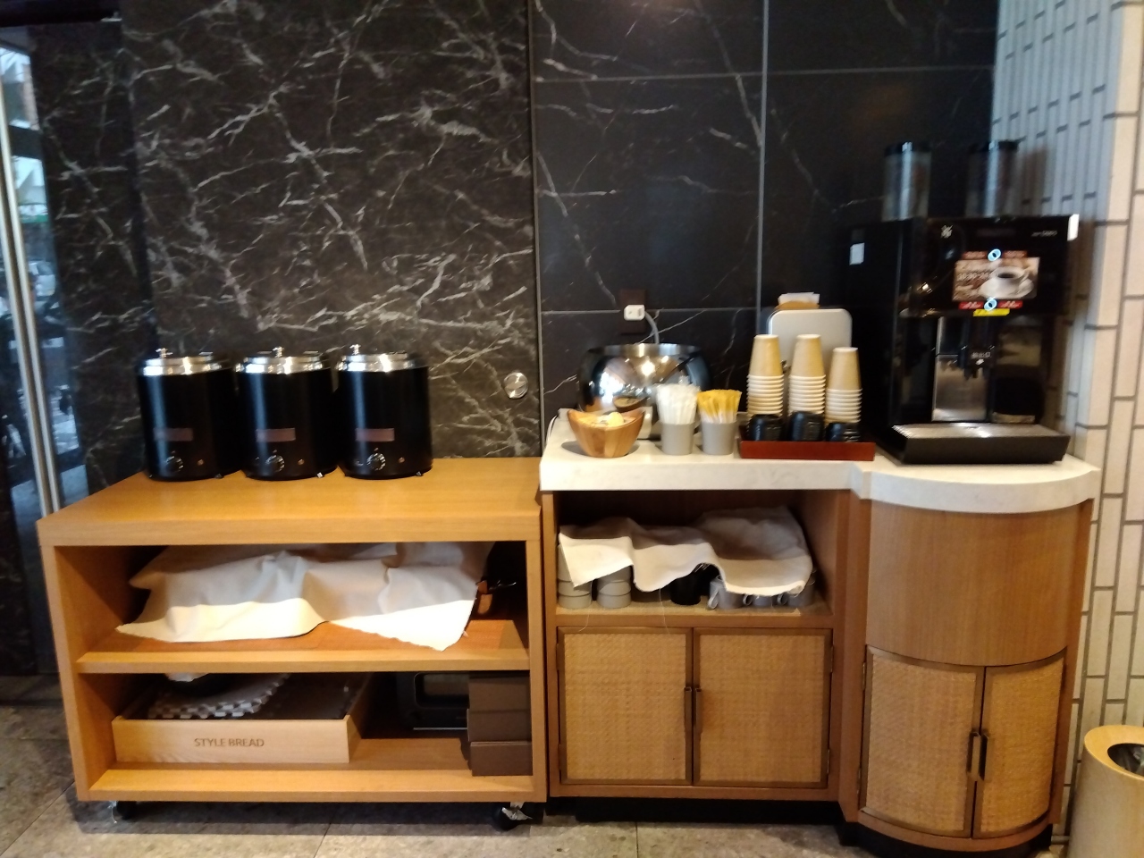 1階ラウンジはフリースペース(10:30-24:00)、コーヒーが無料、電子レンジとトースターもあります。
