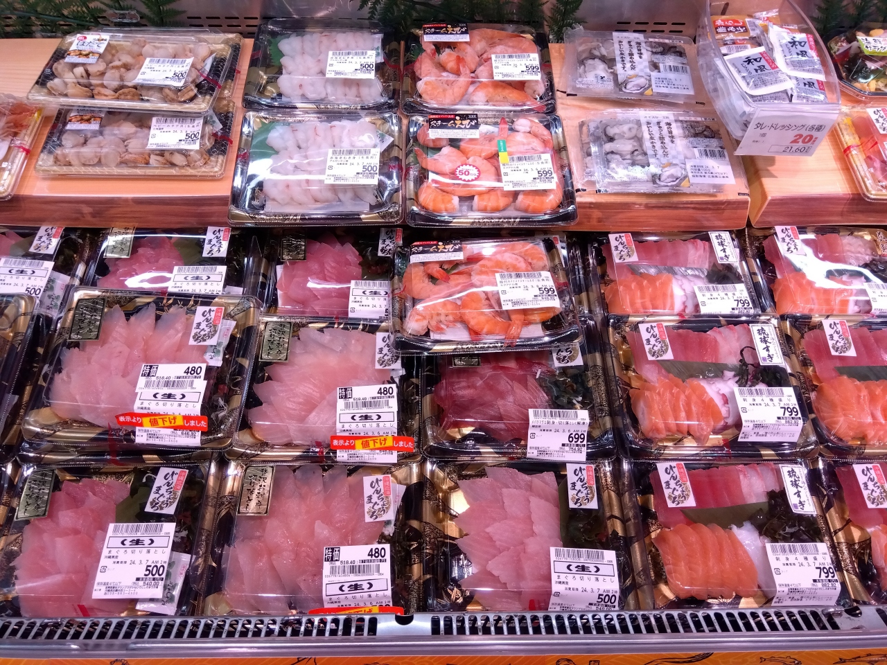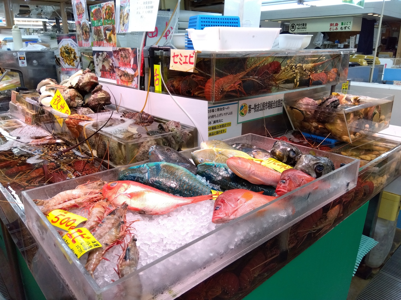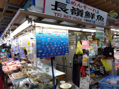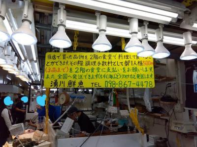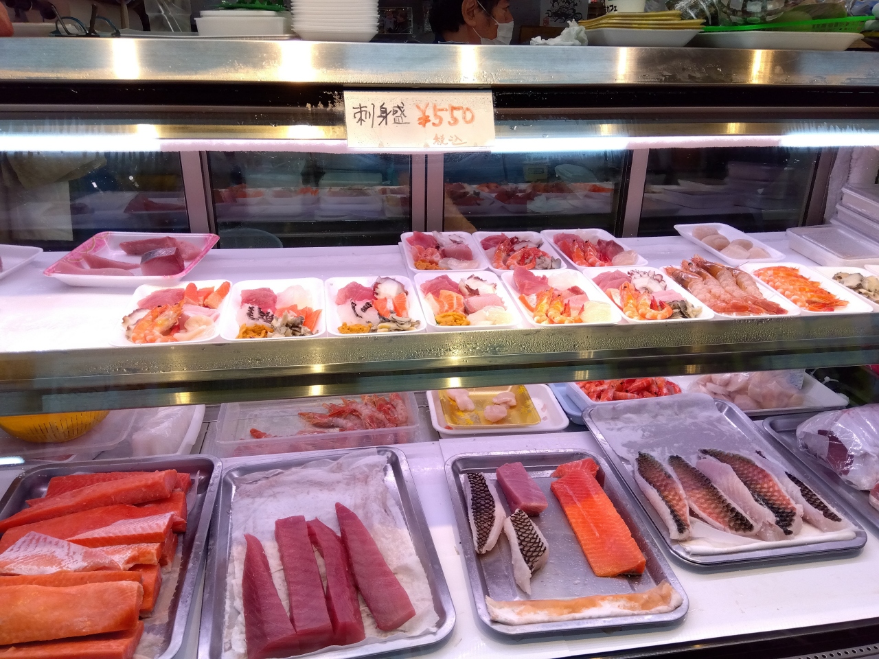 食堂街もほぼ中国系観光客で満席状況。ここでの食事は諦めて、与那嶺鮮魚のガラスケースに並んでいる「刺身盛」を部屋ごはん用に購入しました。