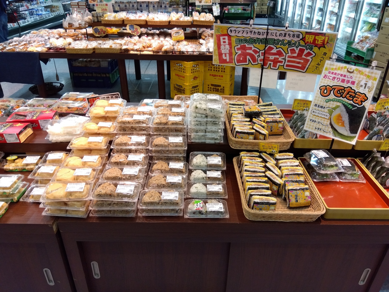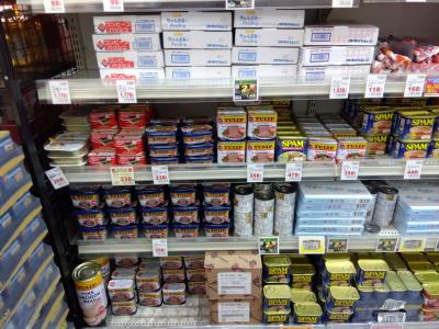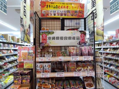 泡盛、チューハイ、とうふ、刺身、もずく、惣菜、弁当、菓子、スパム、などなど沖縄県産のものがいっぱいで、お値段もお手頃です。