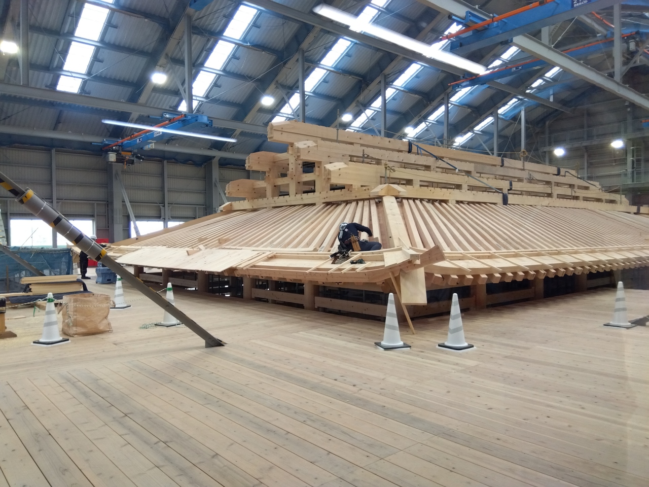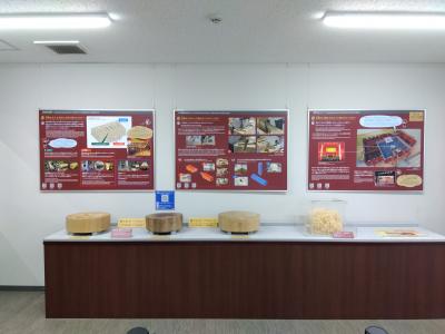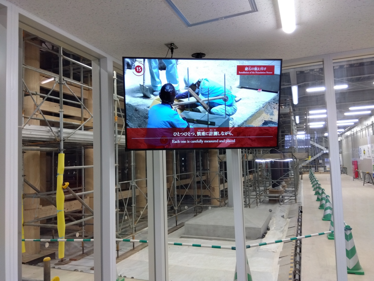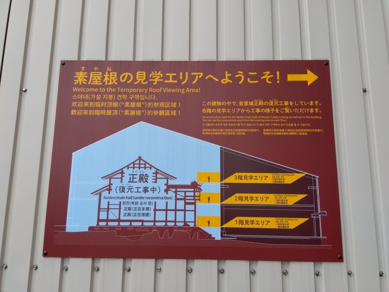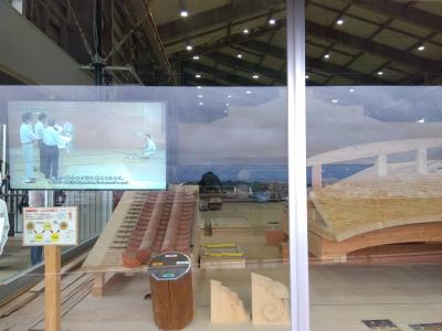 寸場見学エリアに加え、素屋根見学エリア(有料区域内)からも首里城正殿の復元工事の様子を見学できます。雨や風から守るために首里城正殿の復元工事は、「素屋根」という仮説の建物の中で、宮大工さんによる正殿復元工事をしています。映像や展示による説明もあります。