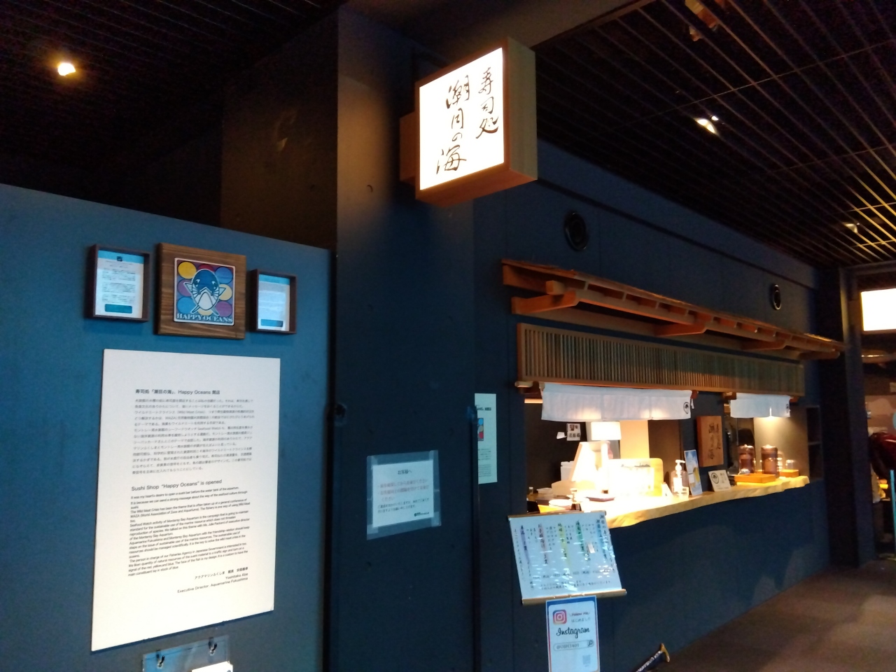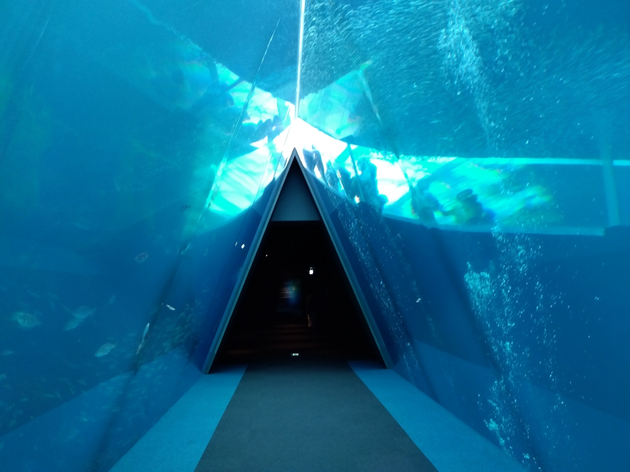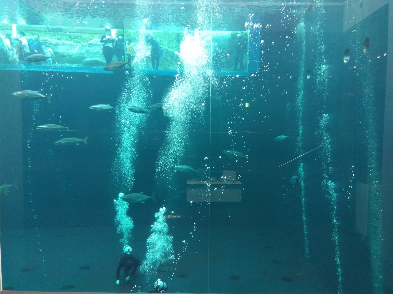 「潮目の海」は、三角トンネル(潮目のトンネル)が潮目を表している大水槽で、回遊魚などを見ることができます。目の前に寿司処があり、水槽を見ながら食べている人たちも。