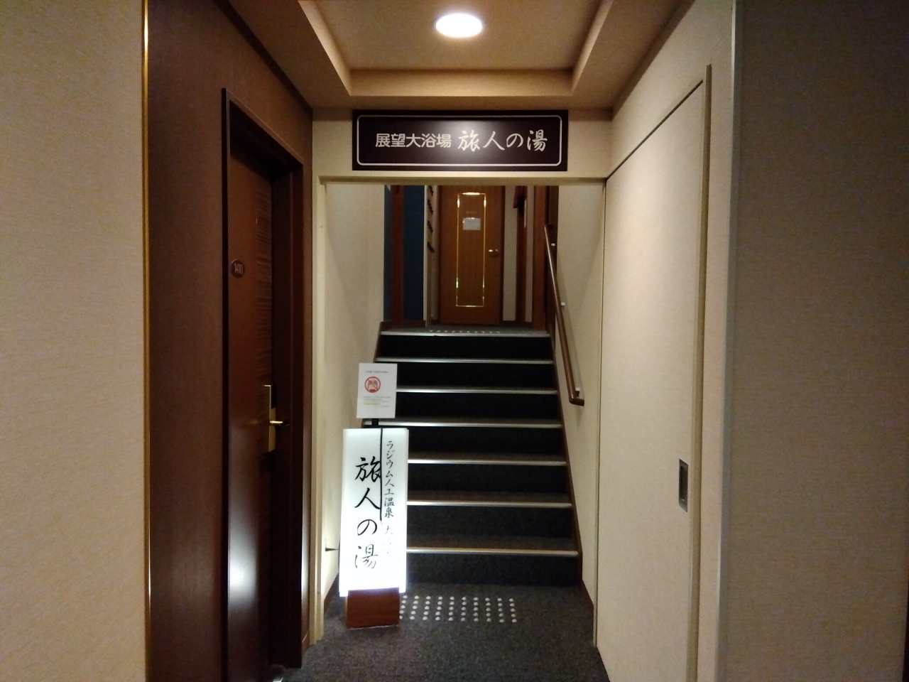 バイキング朝食が無料、ロビーのコーヒーが無料、「展望大浴場 旅人の湯」(ラジウム人工温泉の大浴場)があり、1階エレベーター前に朝刊があります(無料)。