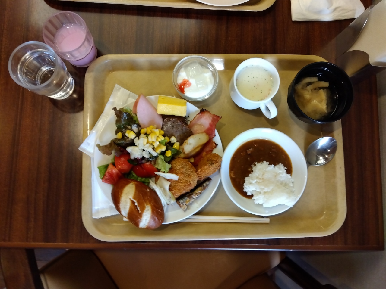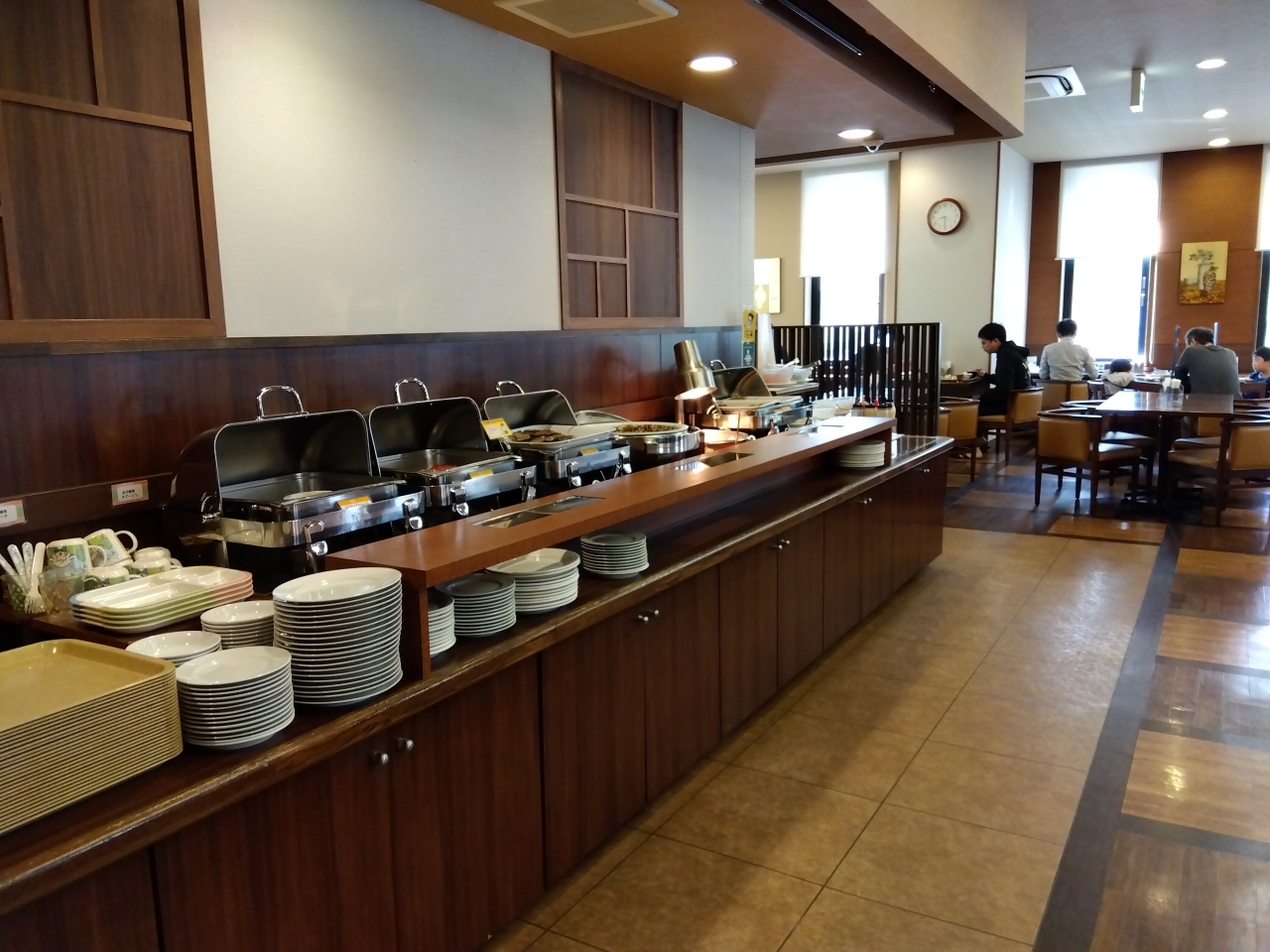 早い時間は団体で混み合うそうで、8時半頃に行ってみたけど、席は半分ぐらい埋まっていて、料理を取るのに並ぶことありませんでした。