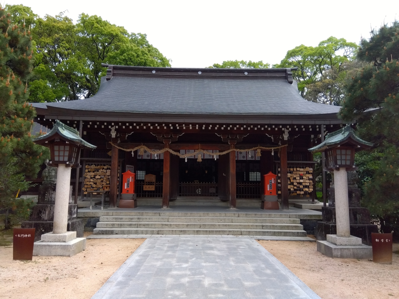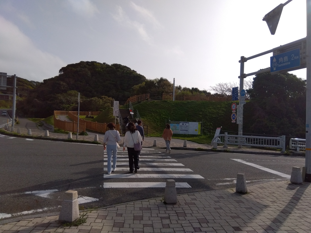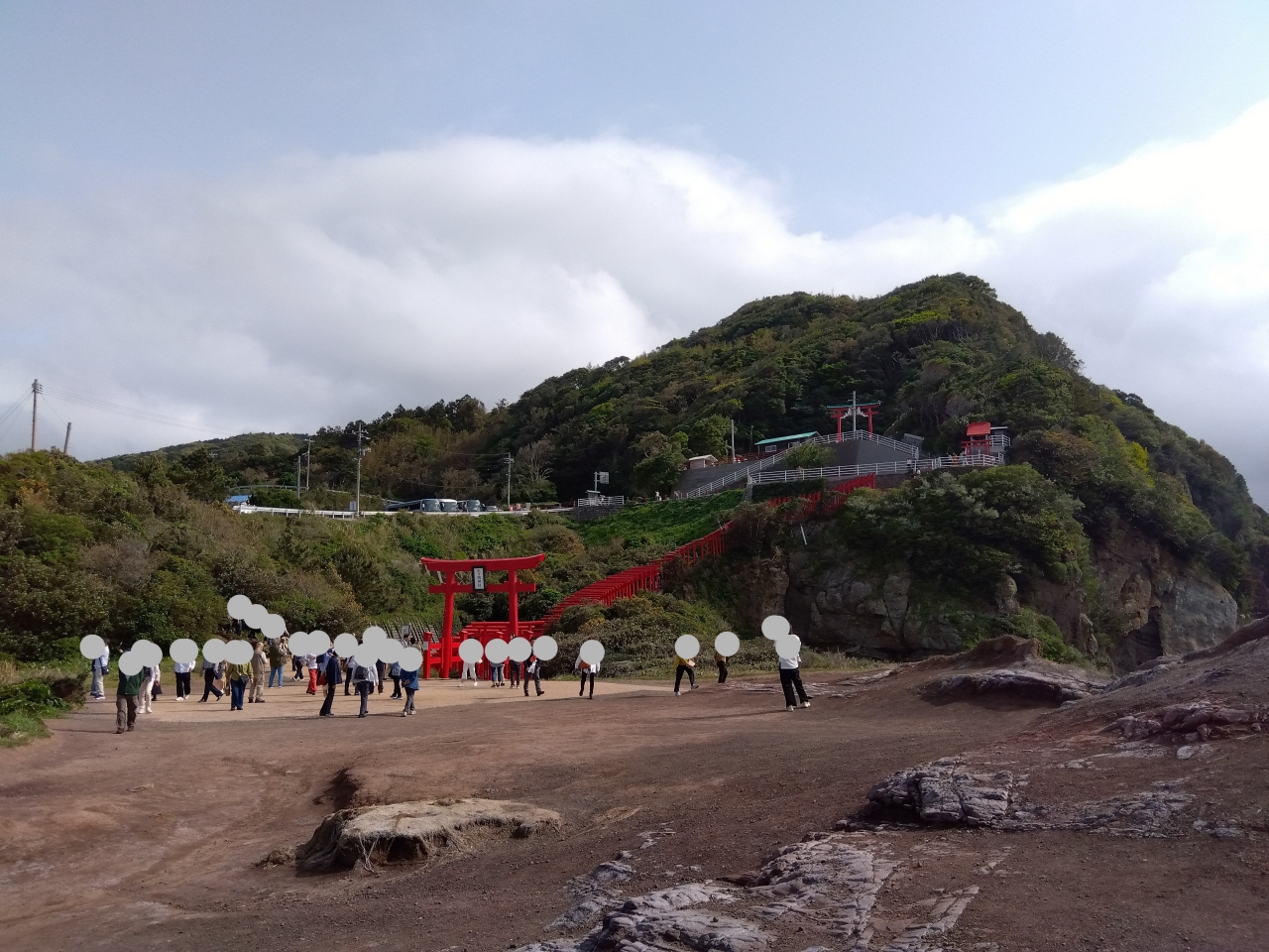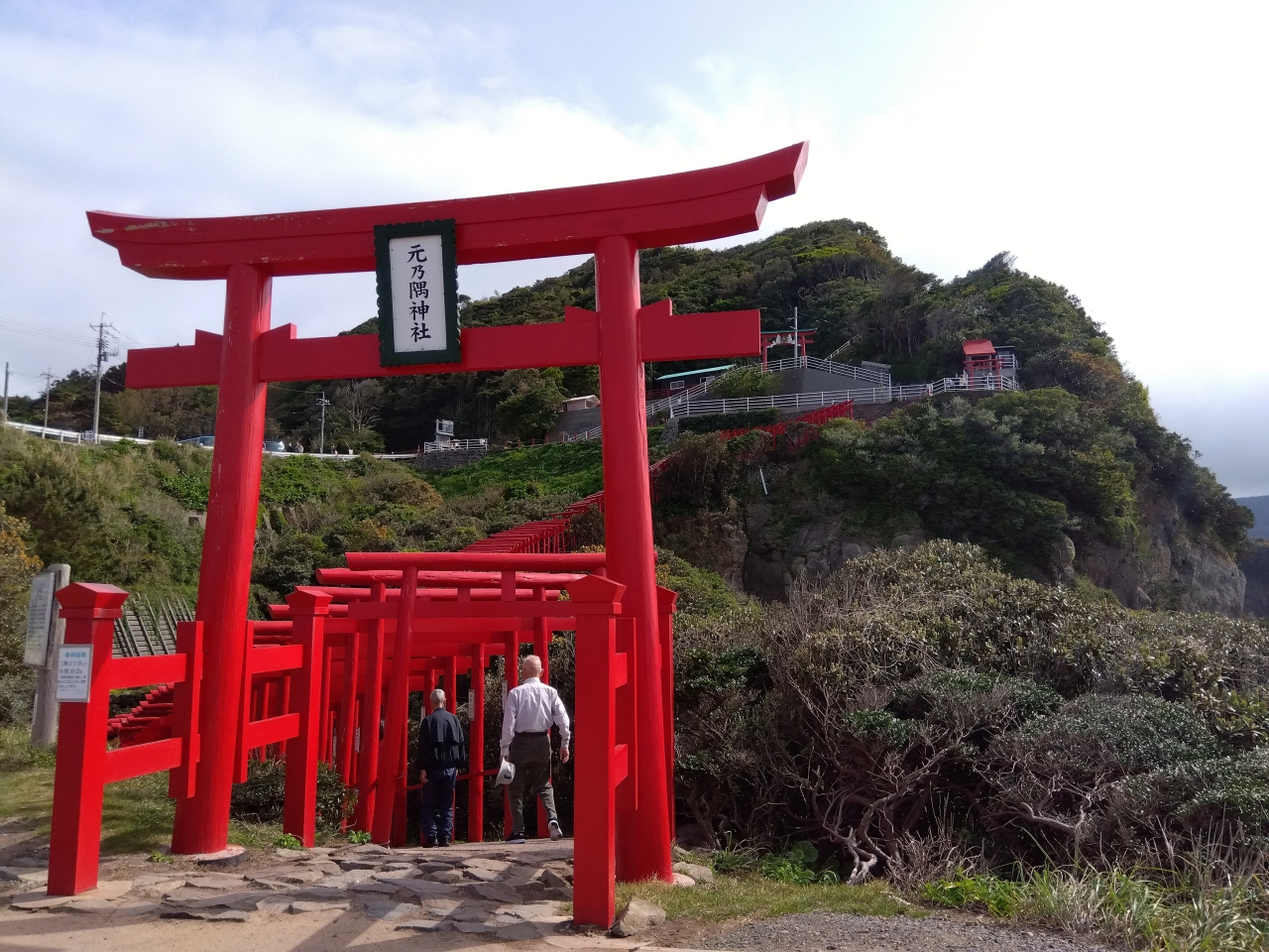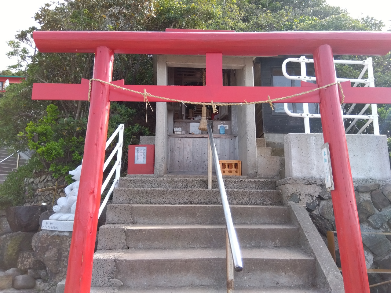 駐車場から道路を歩き、海側へ歩道(階段)を下り、正面の鳥居へ。正面の鳥居が参道の入口となっており、ここから鳥居をくぐりながら階段をのぼり、本殿へ。