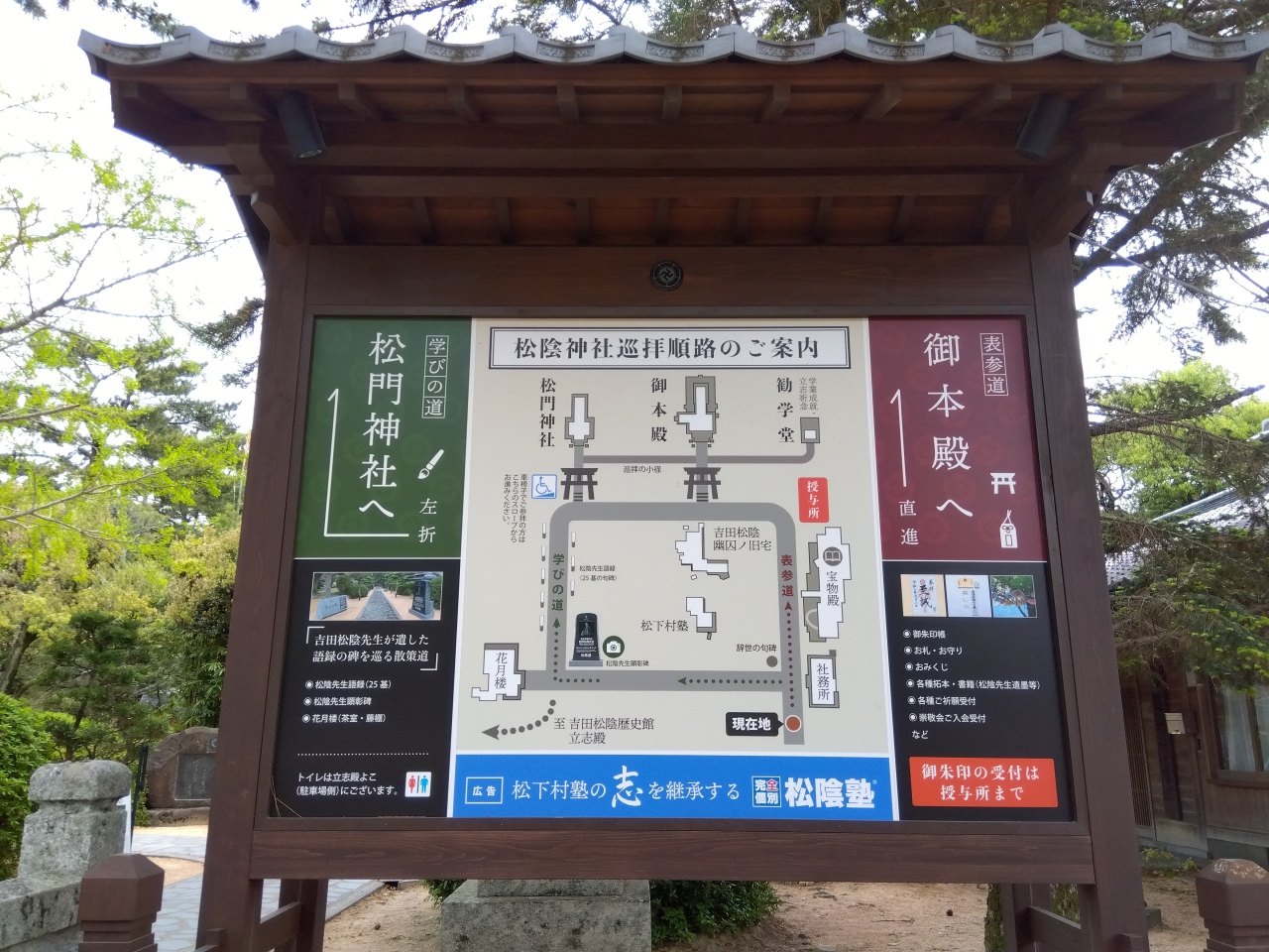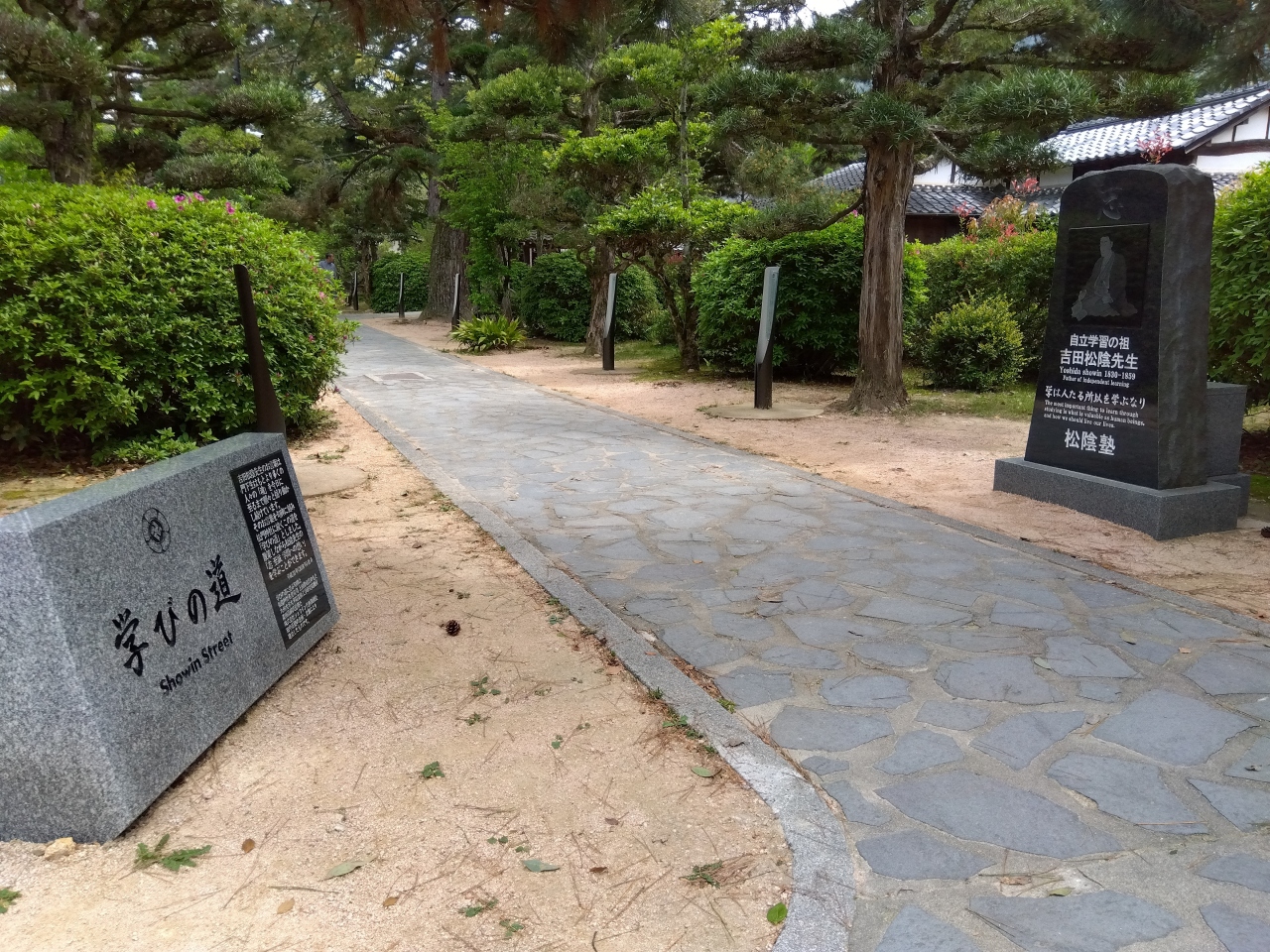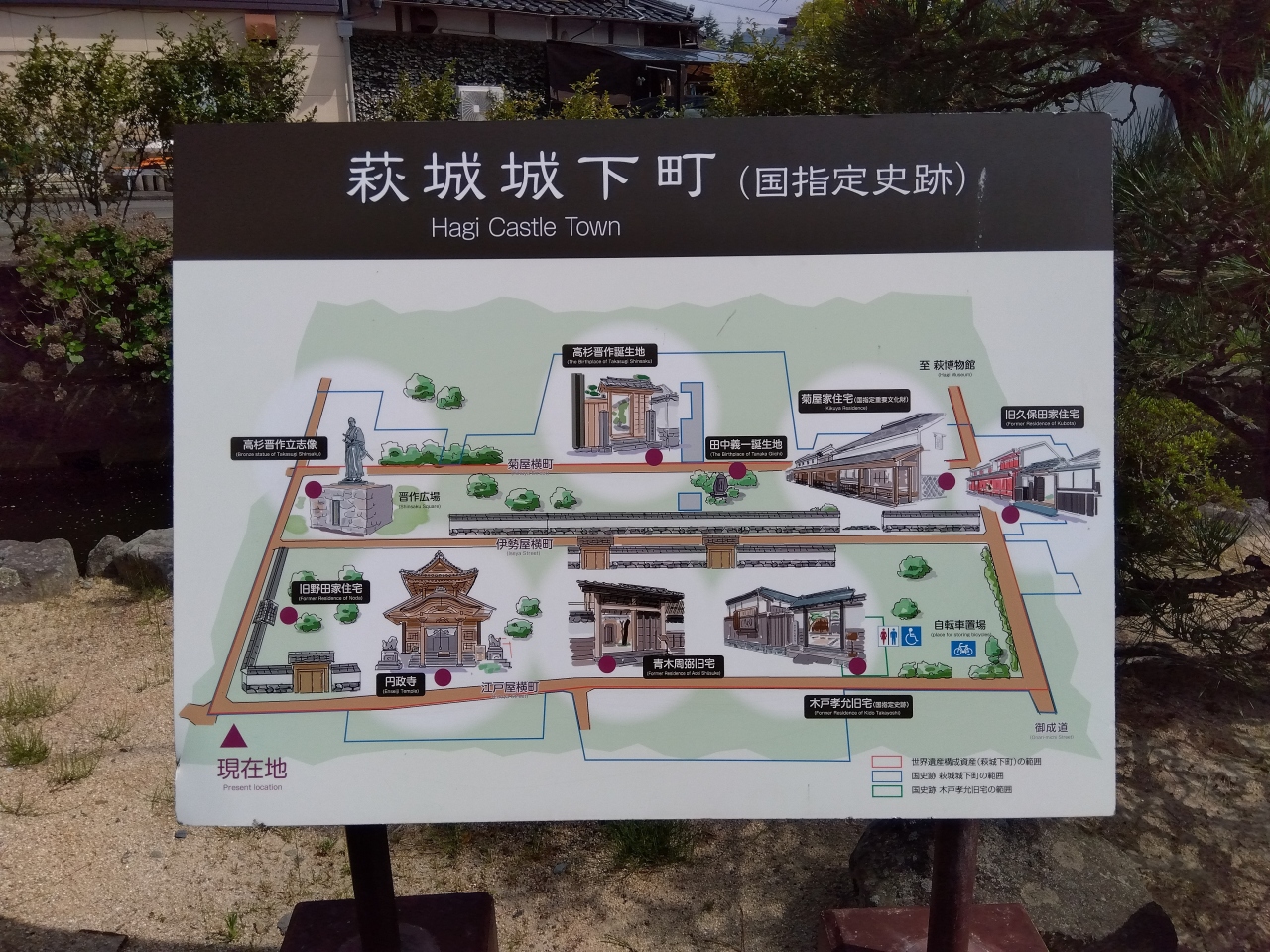 中央公園駐車場から、江戸屋横町(円政寺、青木周弼旧宅、木戸孝允旧宅)御成道(菊屋家住宅)、菊屋横町(高杉晋作誕生地、高杉晋作立志像)の順です。