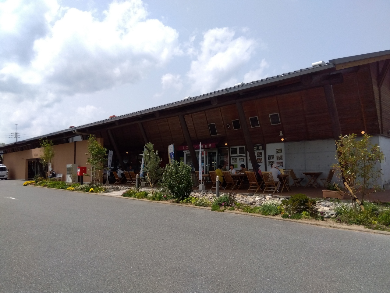 建物の外側には、テーブルとイスがあり、テイクアウトしたものを食べている人もいました。