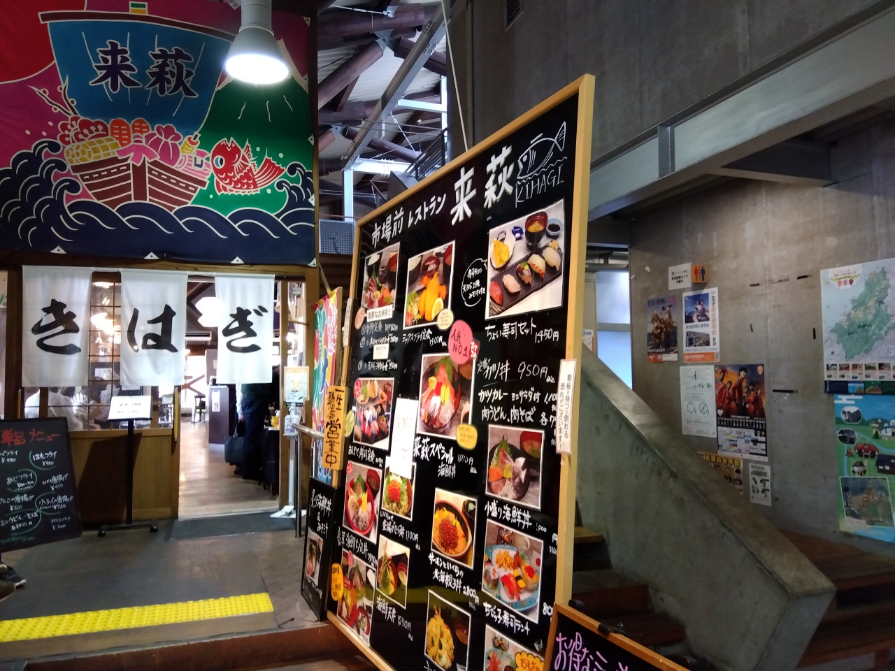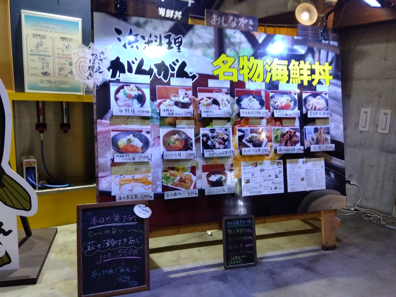 海鮮レストランが3軒あり、海鮮丼や定食の種類が多く、単品もありました。浜料理「がんがん」、レストラン「来萩」、レストラン「維新亭」(臨時休業)のです。