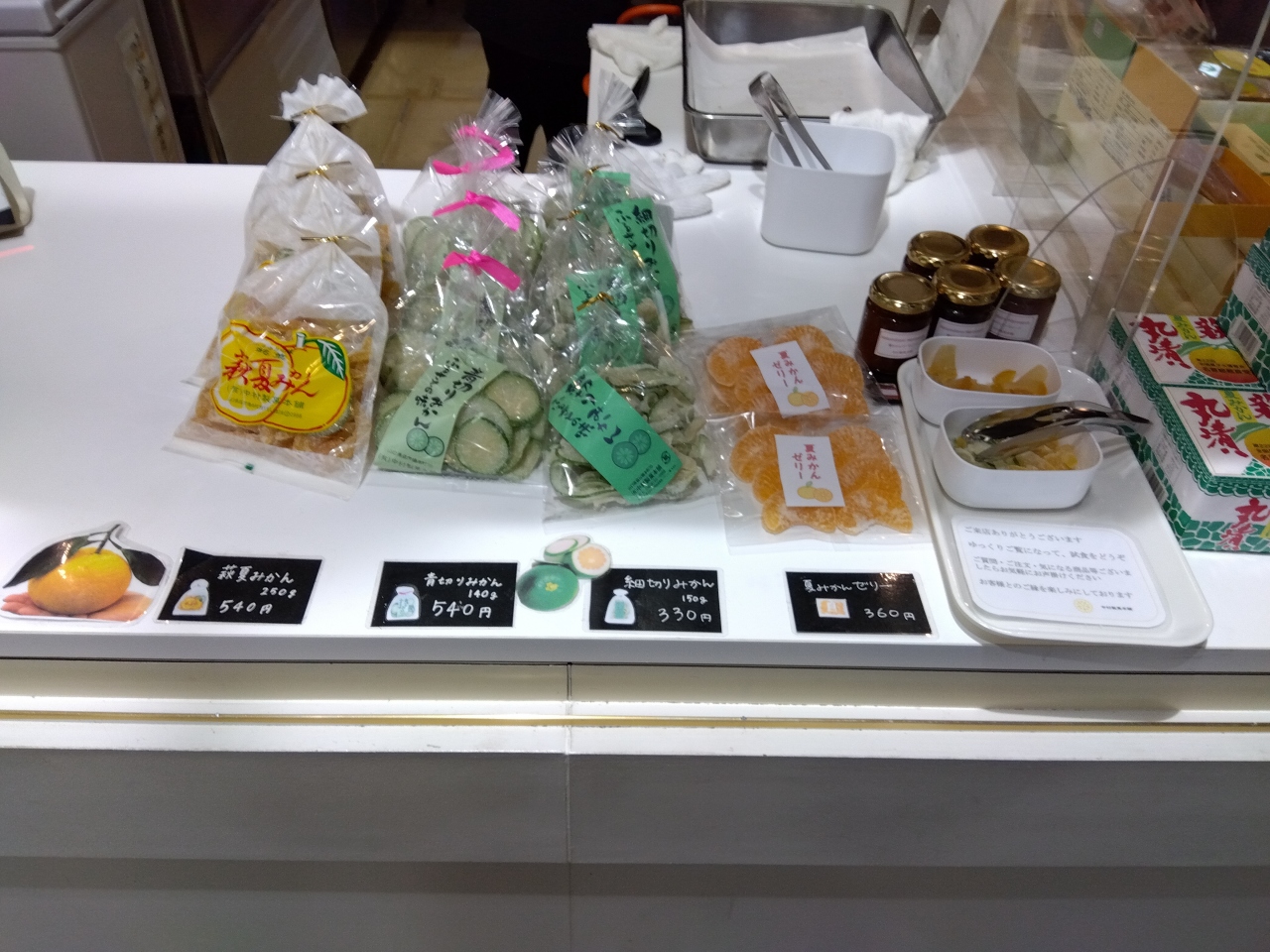 駐車場の向い側のおみやげ処には、萩特産の夏みかん、夏みかんの加工品、ソフトクリームなどが販売されており、「門外不出山口県だけのせとみみかん只今大ブレイク中です。」のポップにひかれ1つ買ってみました。- 旅行時期