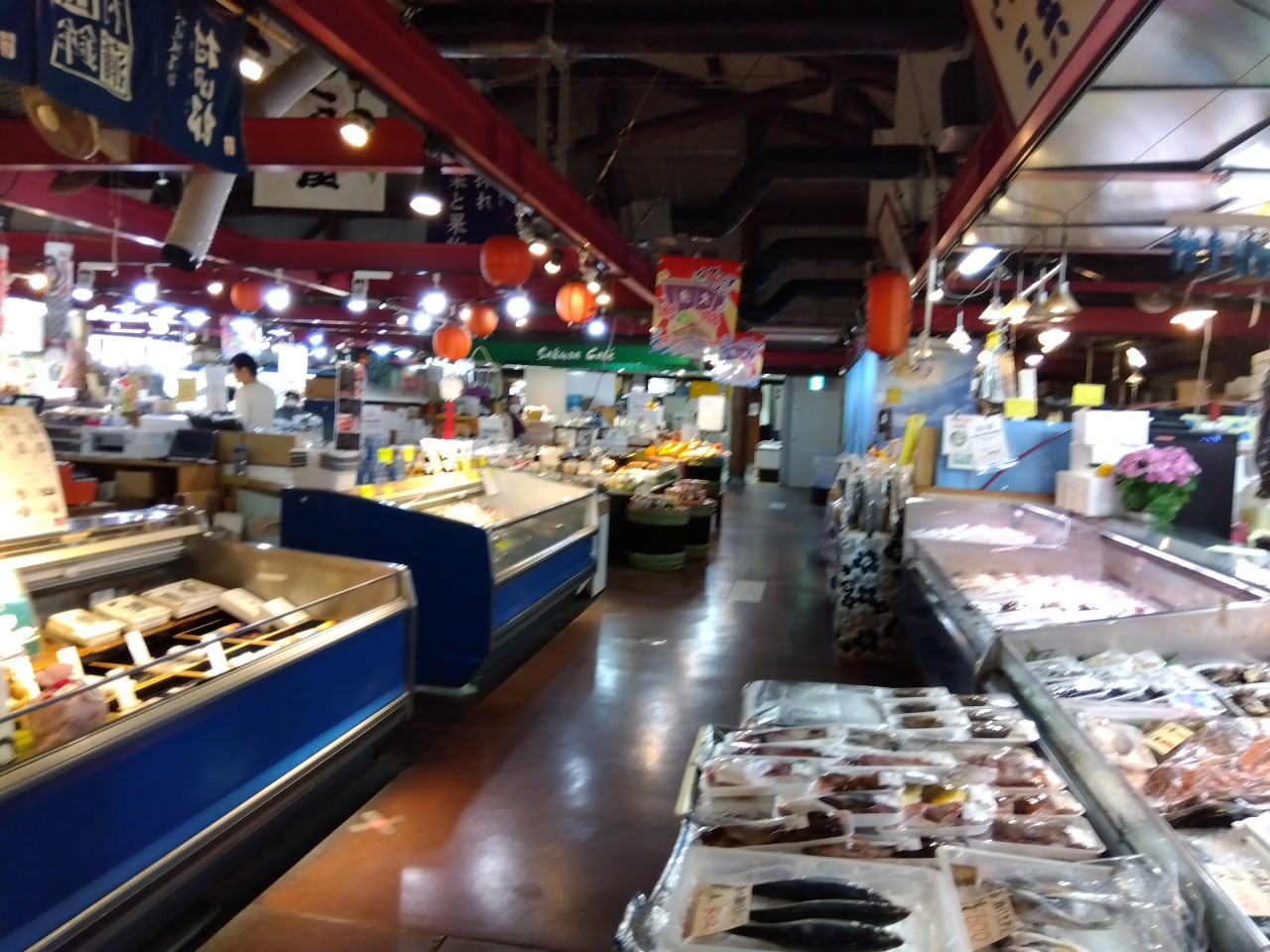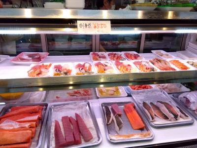 鮮魚店は中国系観光客が多くて、中国語で接客している店舗もあり、通路にちょっとだけ