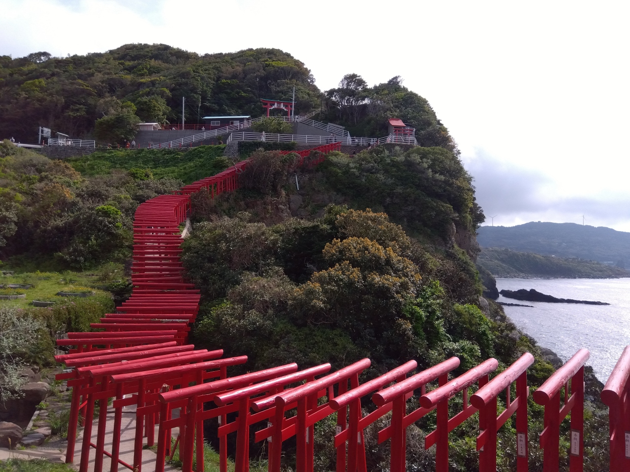 123基の赤い鳥居と青い海が美しい日本海の断崖絶壁に建つ神社です。