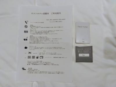 清掃必要は白い札。シーツ交換はグレー札。清掃不要は黒い札。黒い札を貼ると、ドアノブに黒い袋がかけられていて、タオル類、歯ブラシ、水が二人分入っていました。