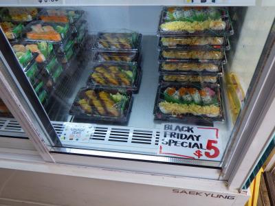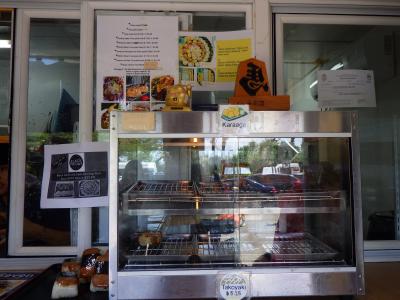 4年前よりメニューが増えていました。右側の冷蔵ケースにあるロール寿司や握り寿司、カウンターのホットケースの唐揚げなどは、待たずに購入できます。