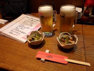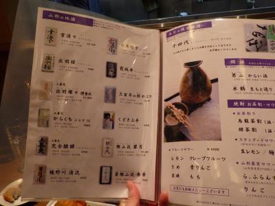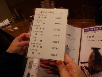 まずはスーパードライ中ジョッキ580円、次は山形の地酒を。一合グラスか徳利かを選べます。メニューには「本日の地酒 十四代」と。聞いてみたところ、「本日の十四代」メニューを持ってきてくれました。一合1,300円から6,800円まで7種類。十四代酒造の生酒「朝日鷹」1,300円、とにかく「旨い」の一言に尽きます。「三百年の掟やぶり」780円も辛口で芋煮にはぴったりの旨さ。締めは「男山からい酒」680円を燗酒で。